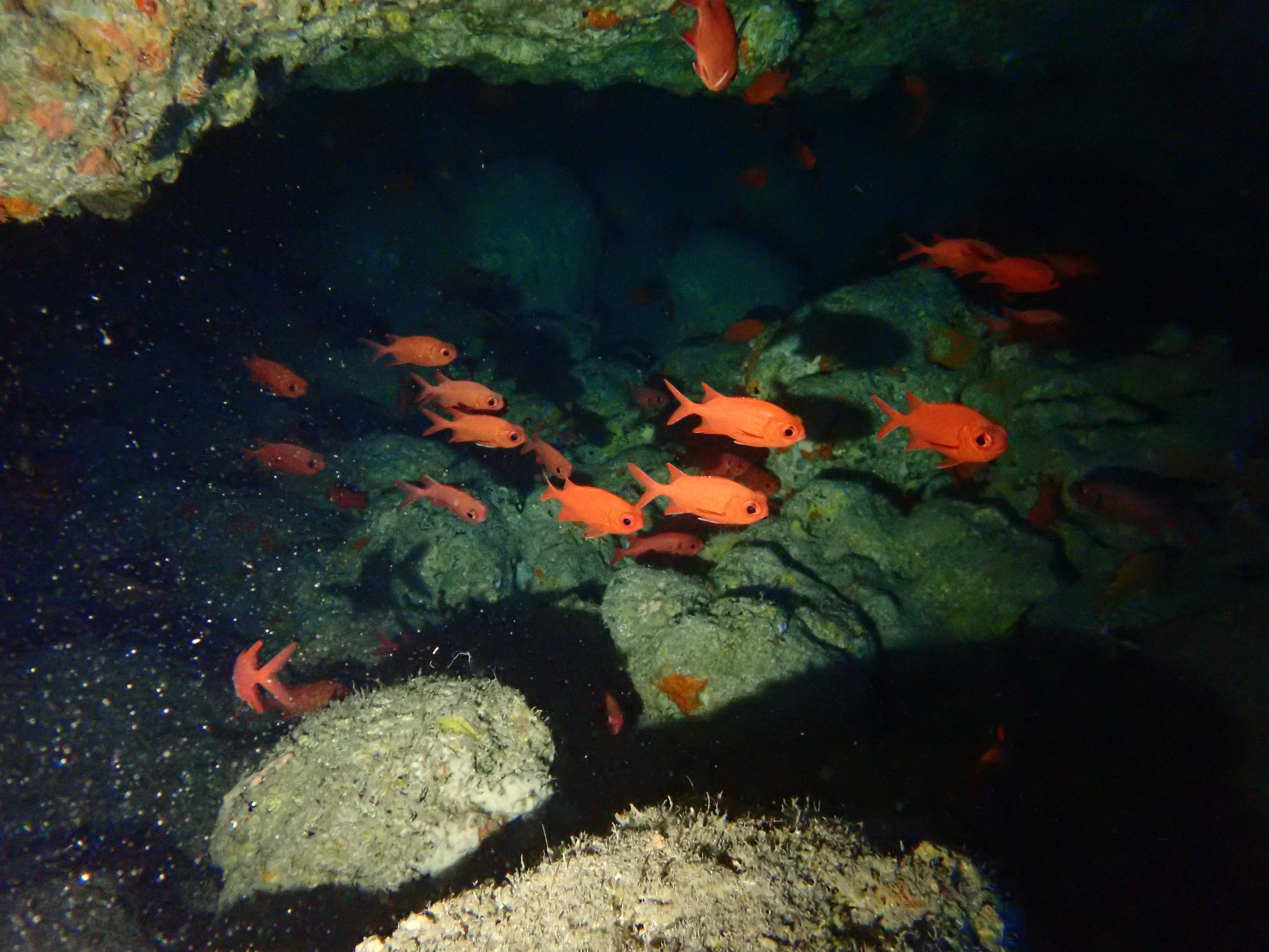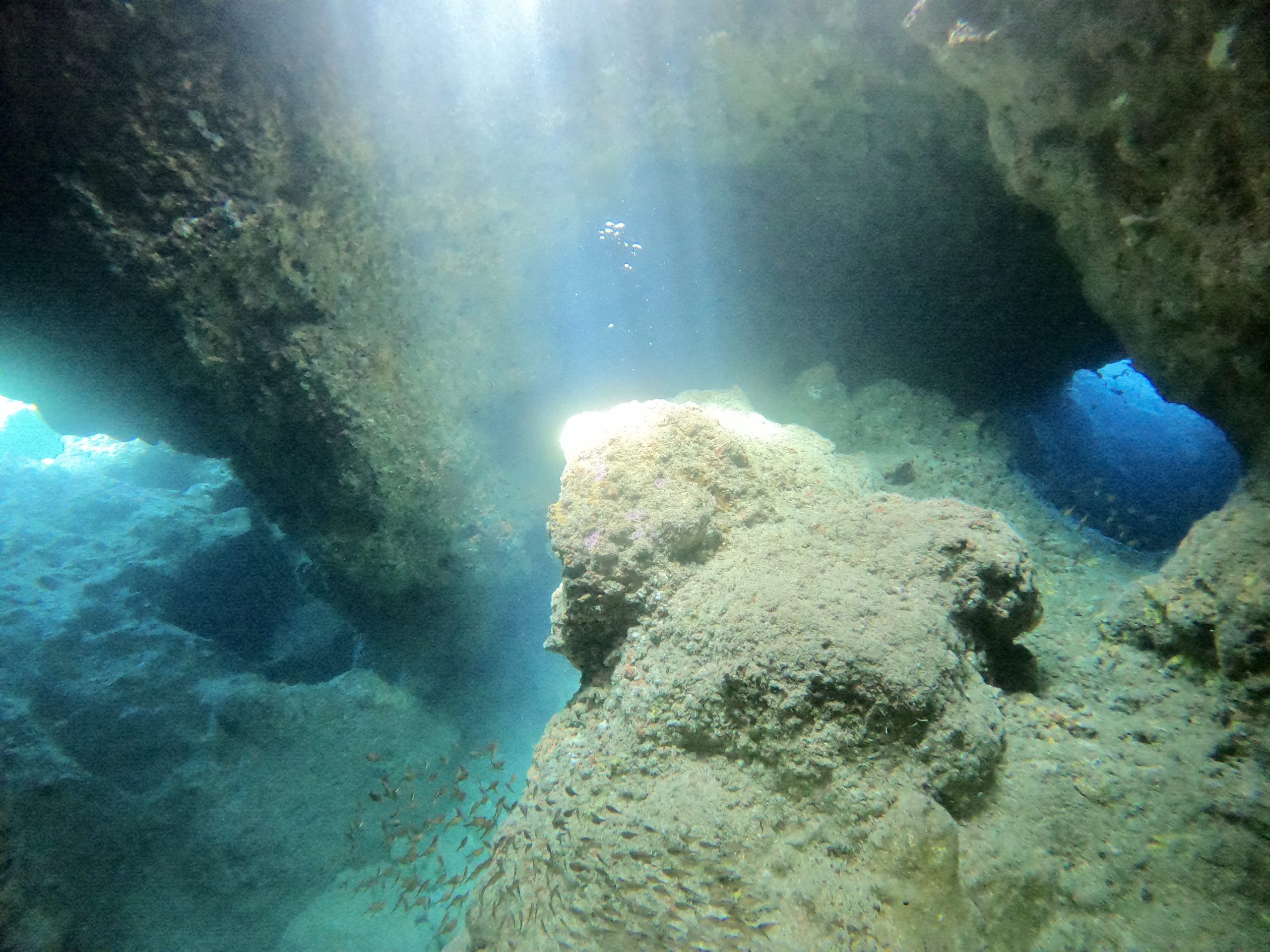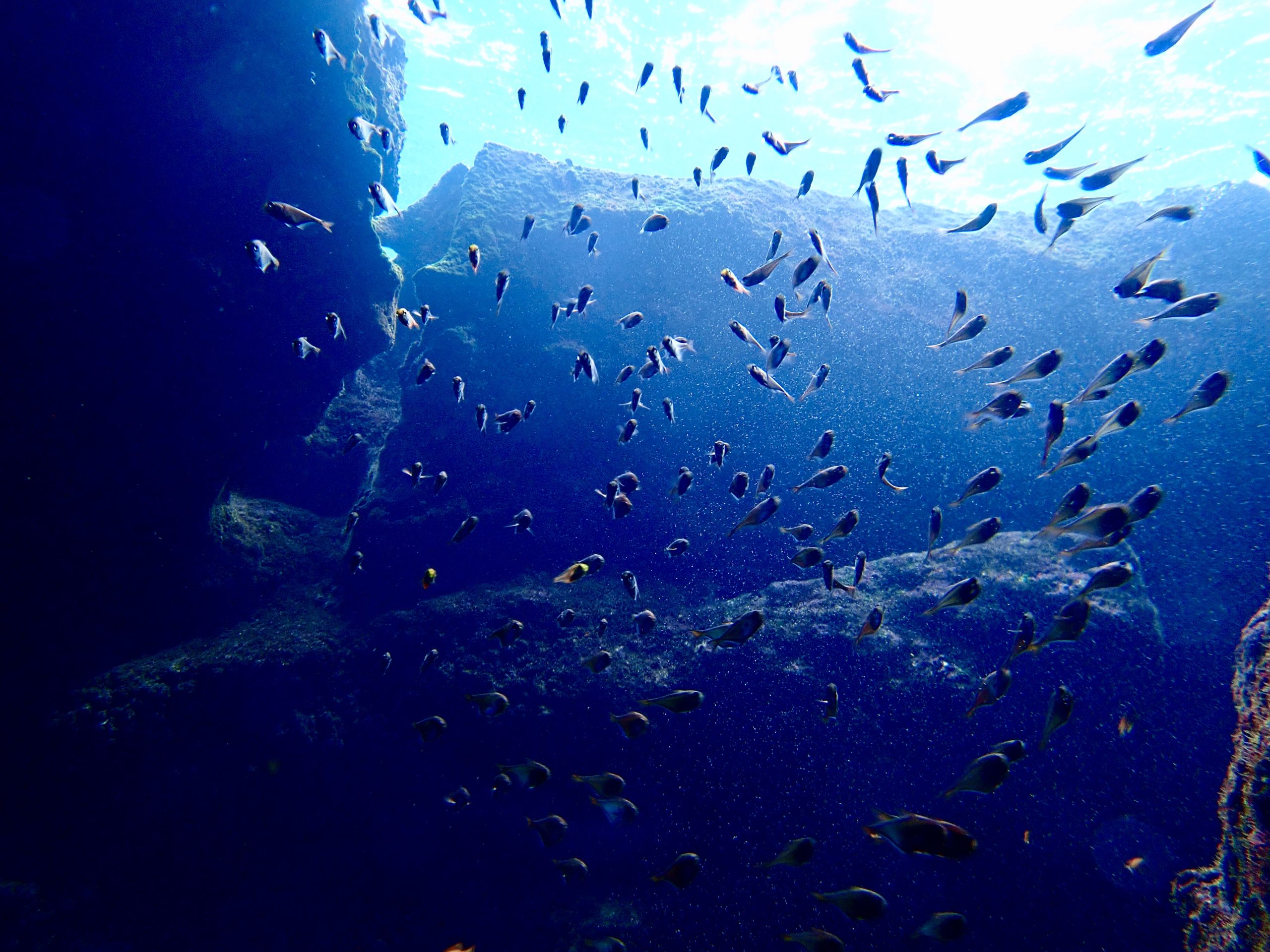 透明度良い感じです。水温は高めです!笑。L字アーチの落とし穴に吸い込まれるように入って行きました。水底は少し冷たかったです。ダイナミックな地形を自由気ままに泳いできました。ワープホールの中もサカナがたくさん!みんなでライト片手に探検してきました。