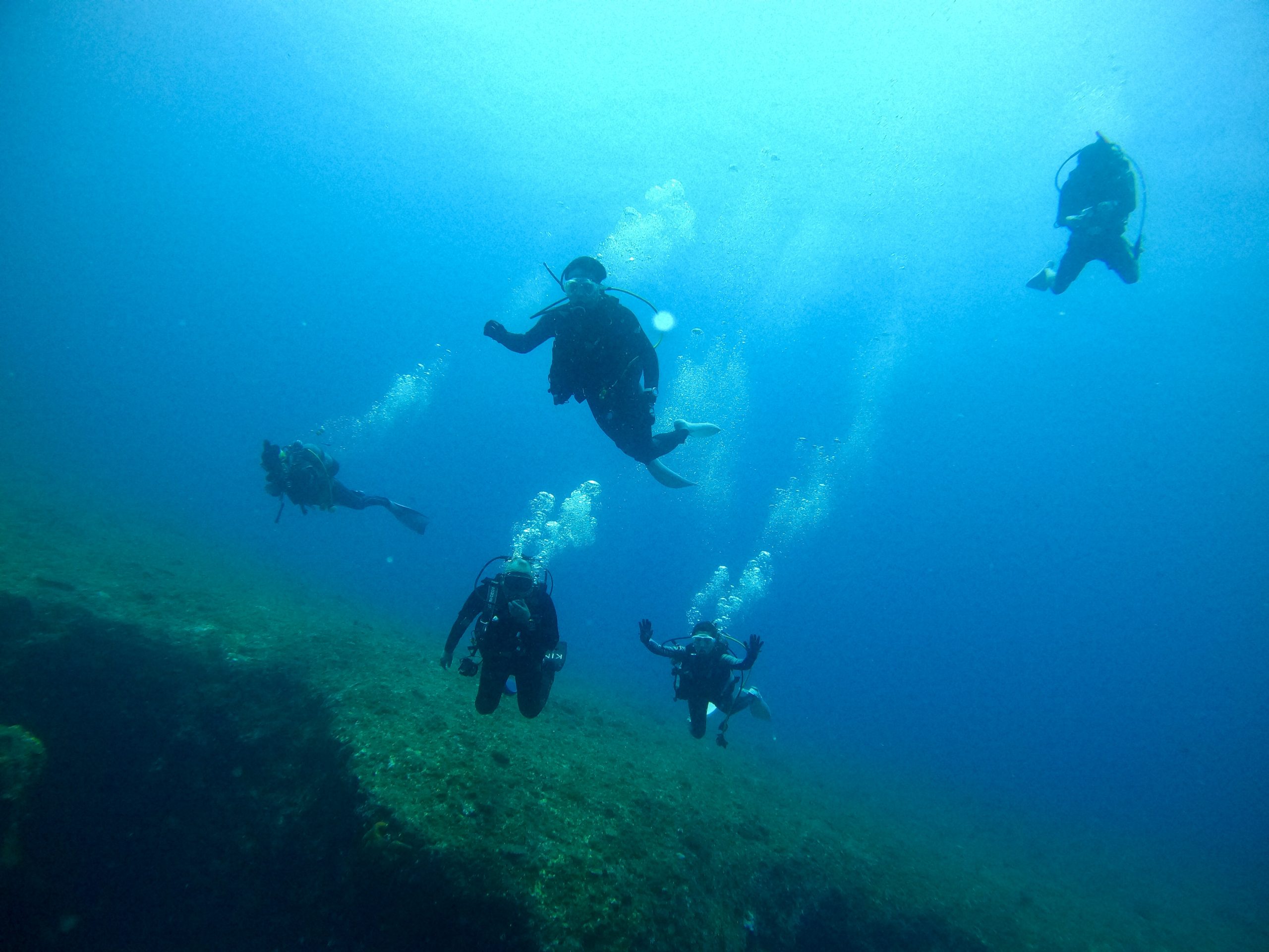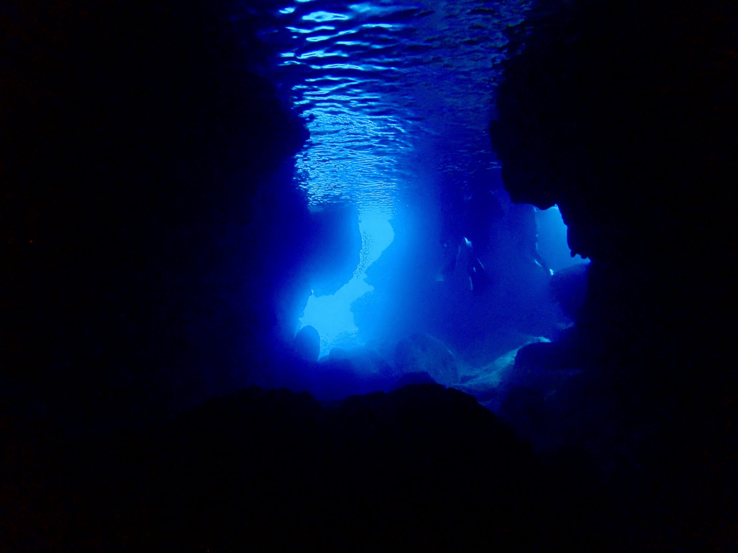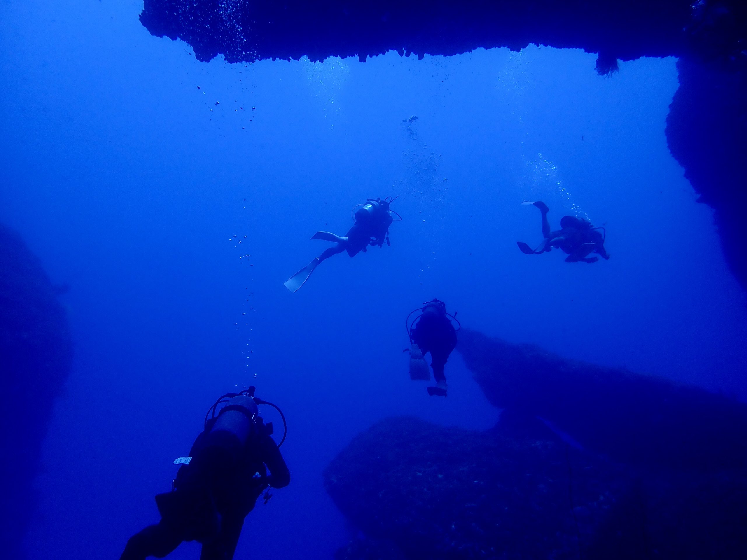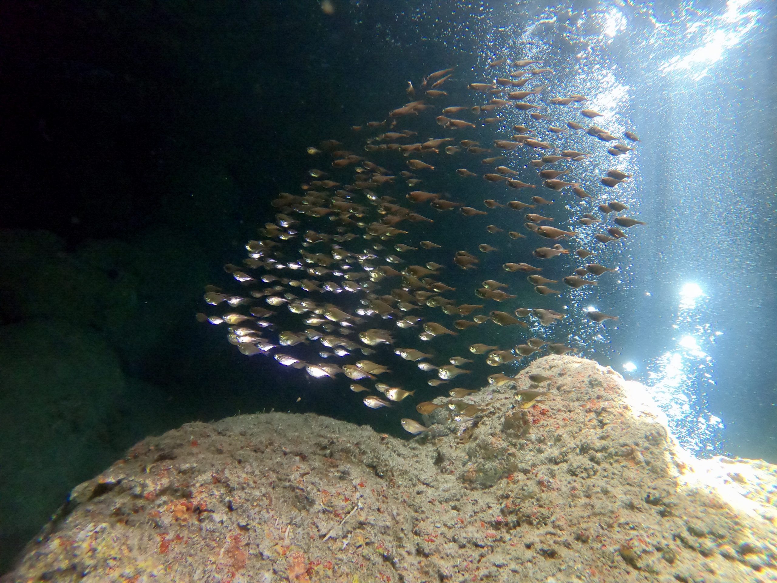 透明度良い感じです。水温は高めです!笑。L字アーチの落とし穴に吸い込まれるように入って行きました。水底は少し冷たかったです。ダイナミックな地形を自由気ままに泳いできました。ワープホールの中もサカナがたくさん!みんなでライト片手に探検してきました。
