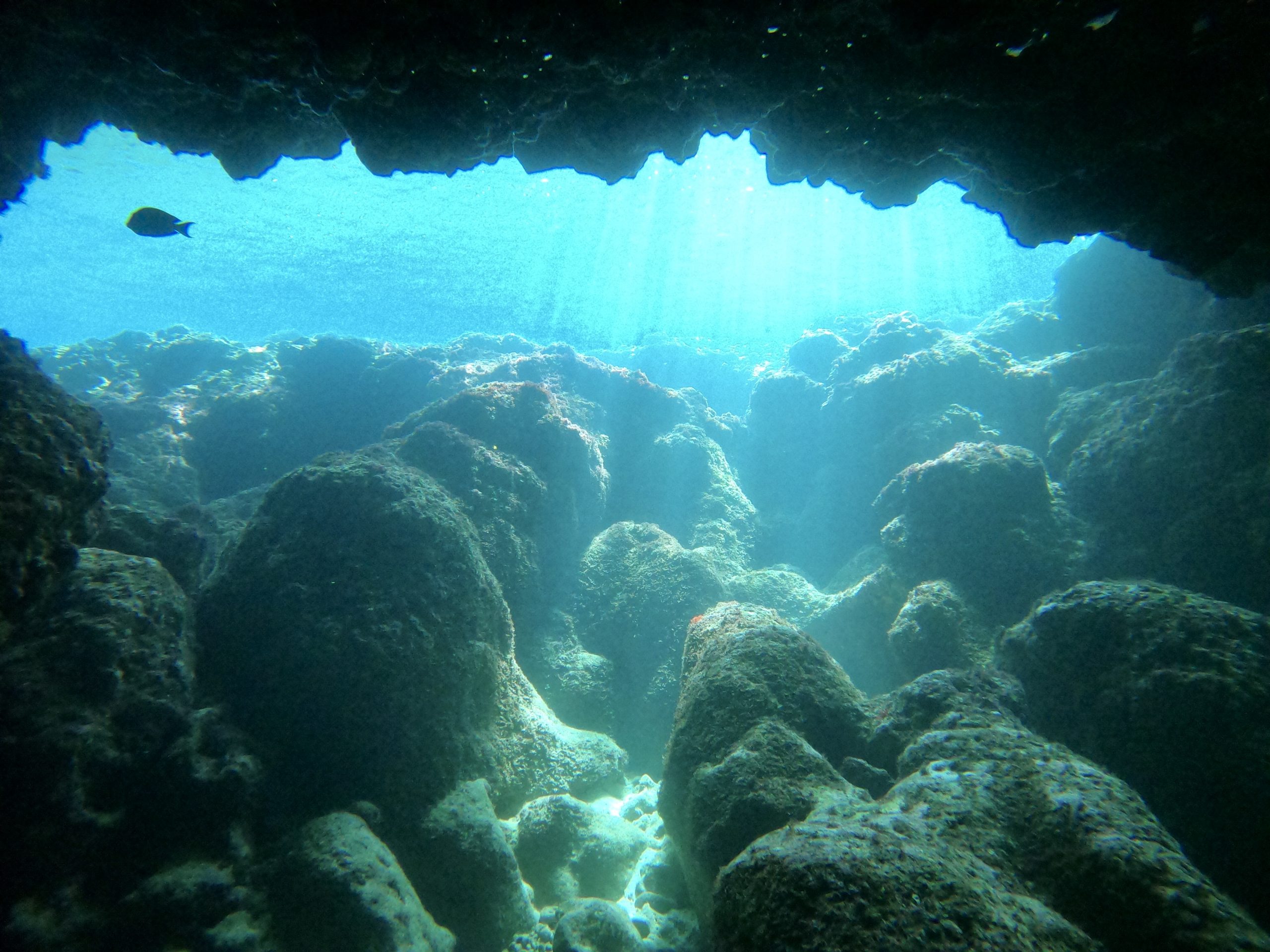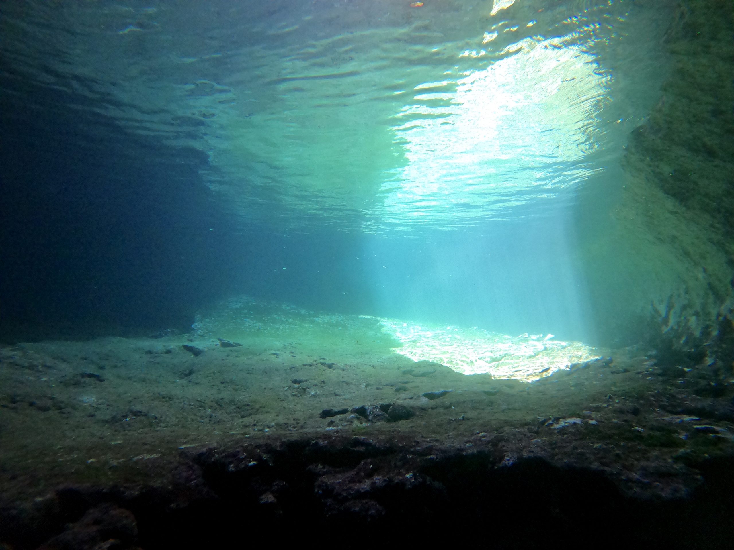 朝一番が満潮だったので、サプライズホールへ向かいました。向かう途中も光が斜めに入ってきます。水面もキラキラしていて美しいです!ホールの中のブルーは今日も見事でした。セノーテに似ている!らしいです。メキシコ行った気分で潜ってきました。