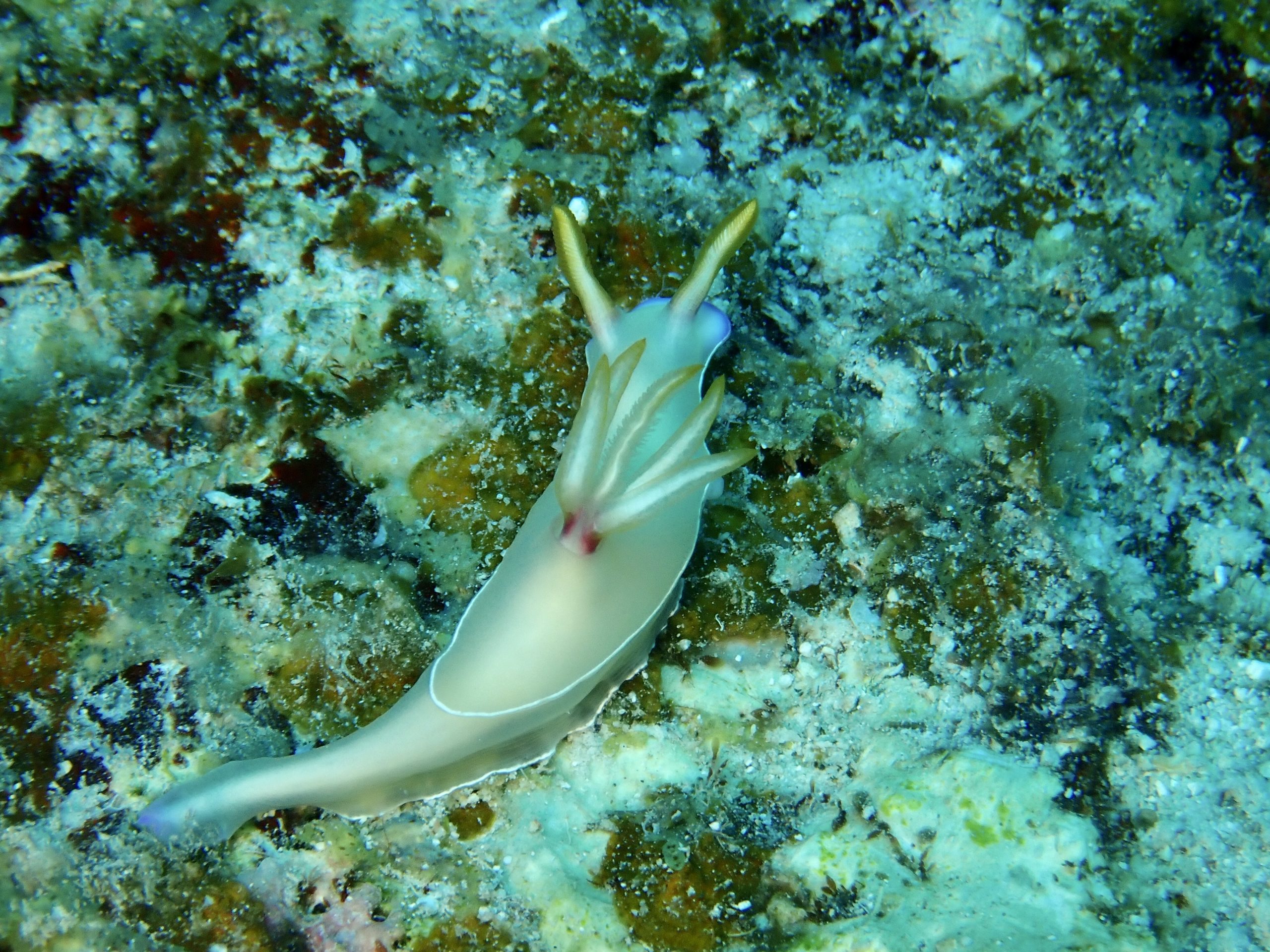 最後は中の島ホールへ!オキナワスズメダイがたくさん群れていました。縦穴のホールにも光がたくさん入ってきます。大きめサイズのキスジカンテンウミウシがホールの中に!出口のブルーは今日は特別青かったです。アカククリがもたくさん群れていました。
