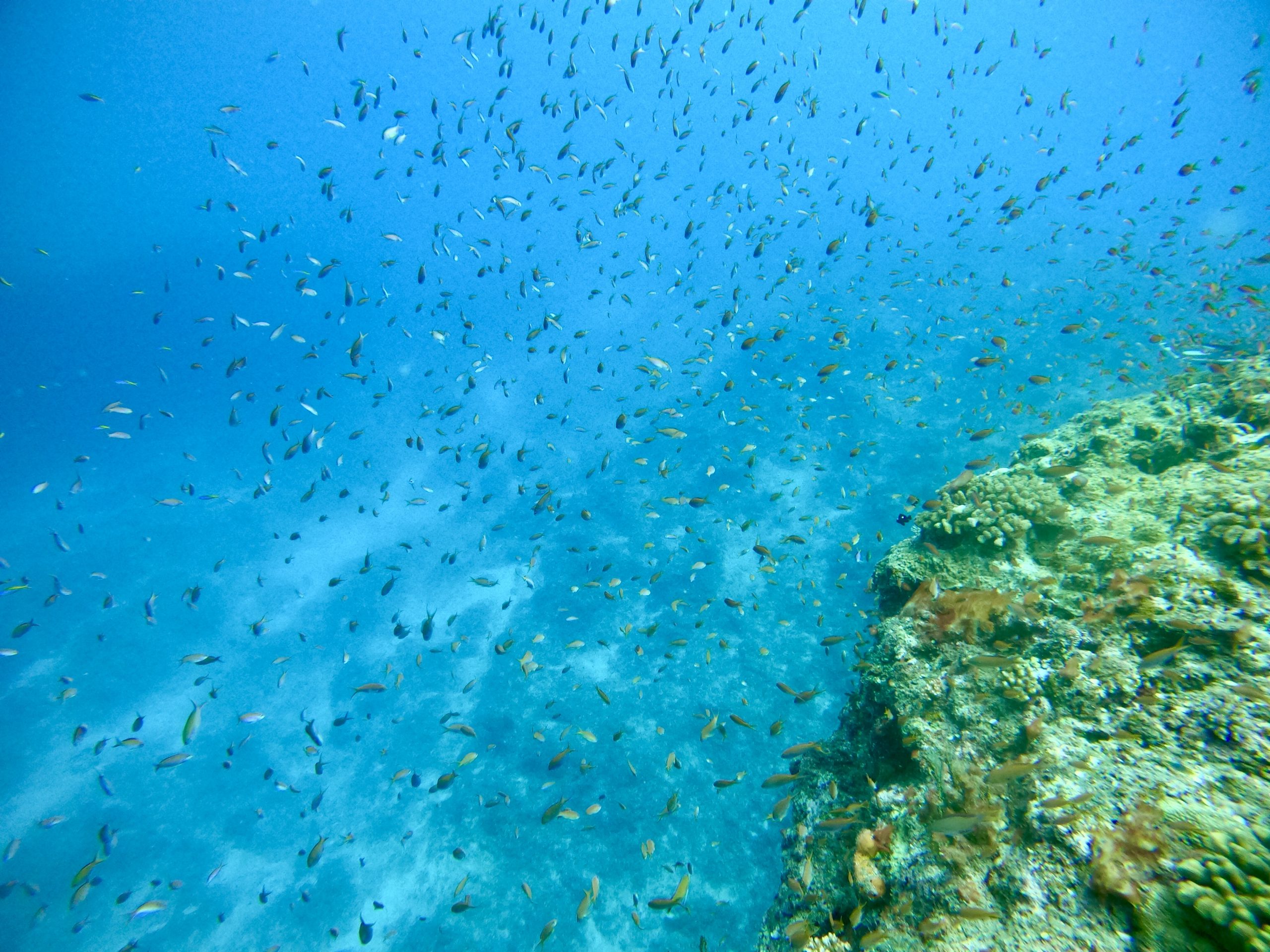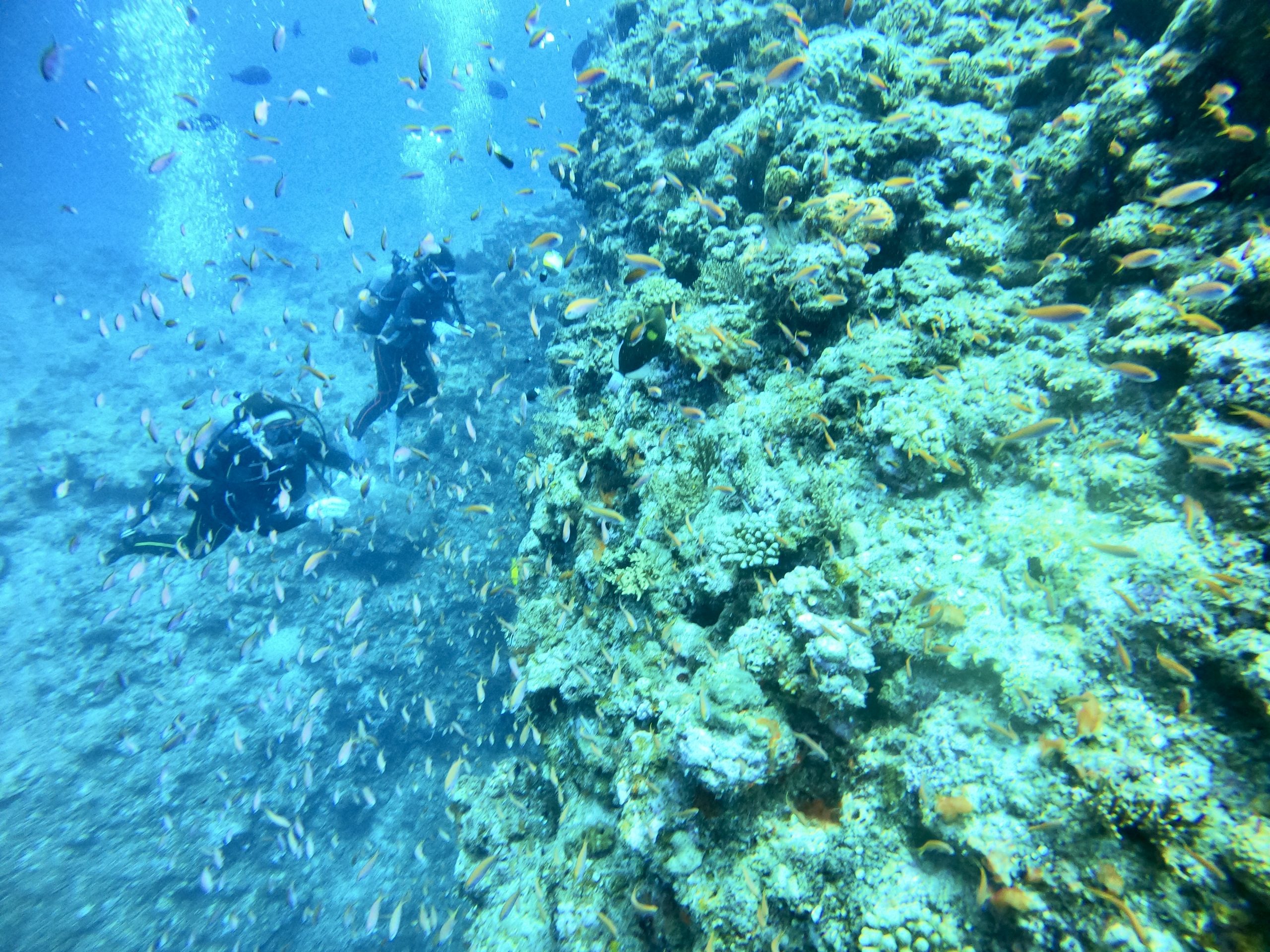 少し潮が流れていましたが、オーバーハングの根に向かいました。根にはキンギョハナダイ、アカネハナゴイ、オキナワスズメダイとサカナがたくさん!ずーっと見ていられます。掴めそうな距離間で目の前を泳いでくれています。なんとゲストさん!一瞬通ったマンタを見たとか!!ラッキーでしたね!!
