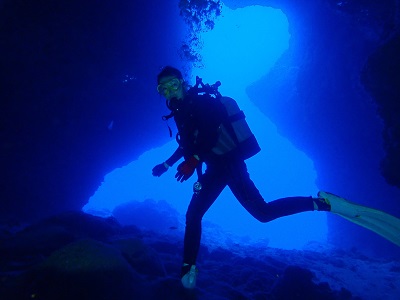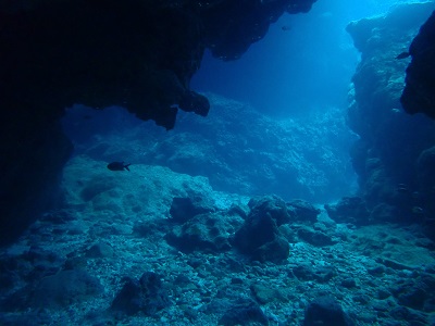 体験ダイビングのゲストさんは2チームに分かれて!船の下で生物鑑賞したり、経験あるゲストさんはショートケーブまで探検してきました。雨なので、光は入りませんでしたが、トンネルの中のブルーが素敵でした。