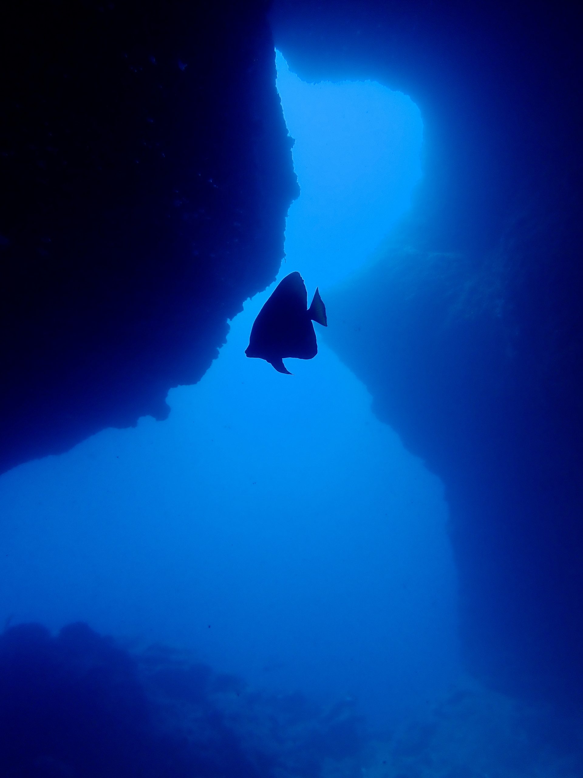 続いても湾内で中の島ホールへ向かいました。大きな縦穴を降りつつ、踊り場から見上げるエアーはキラキラしていました。砂時計型の出口にはアカククリ。絵になります!帰りはホソカマスを探してウロウロしてみるも・・・透明度も悪かったせいか今日は出会うことができませんでした。残念!!