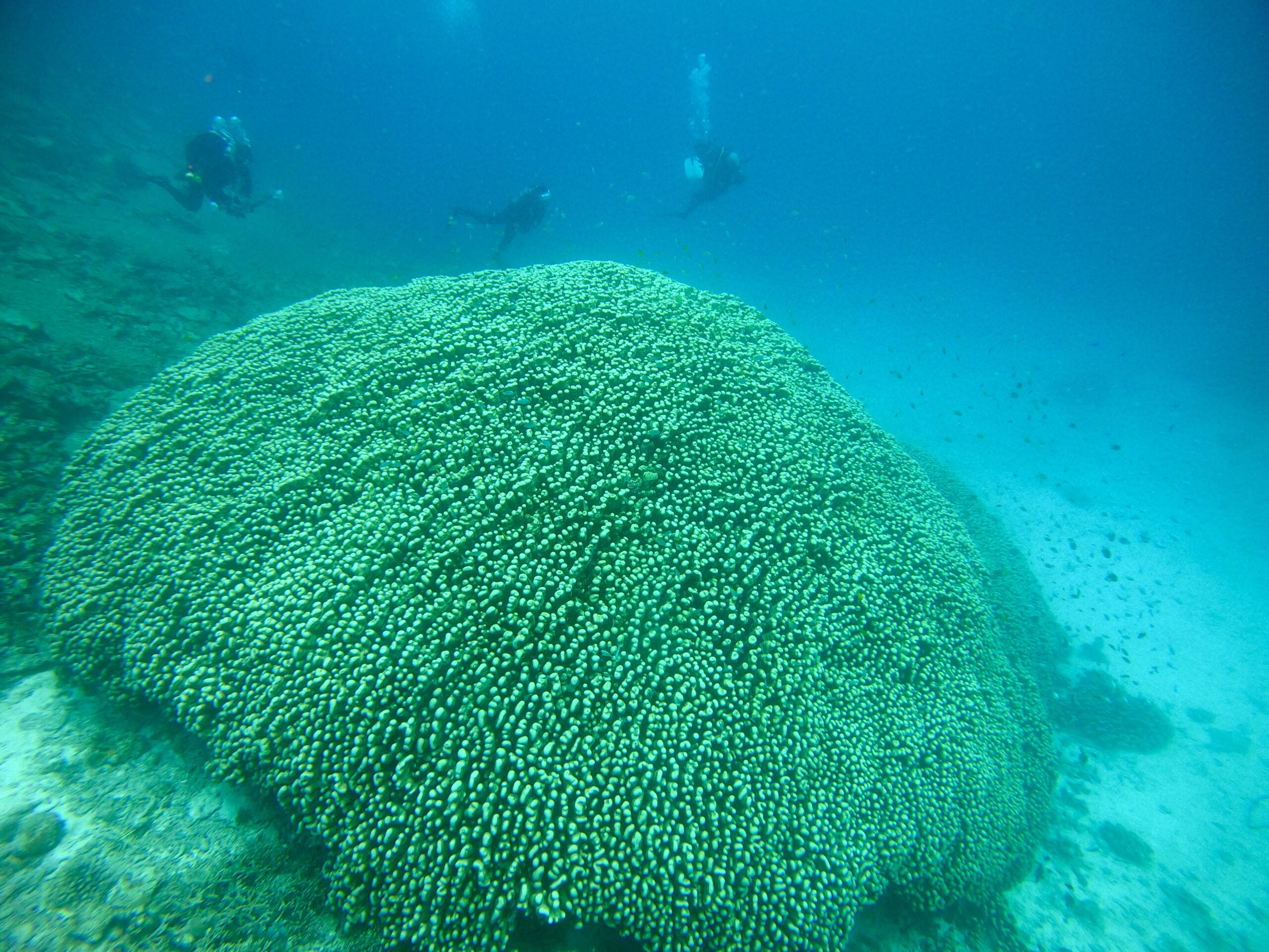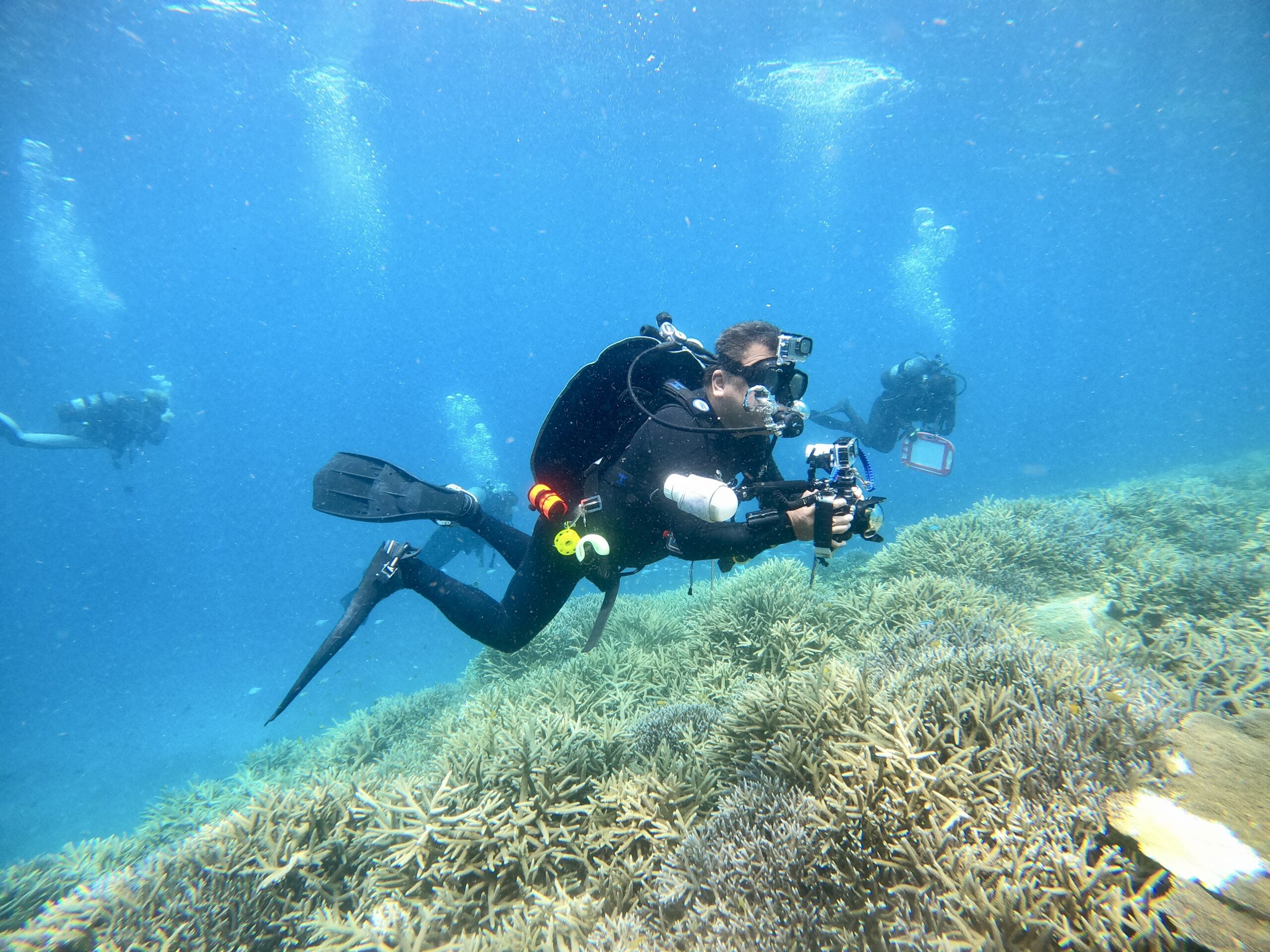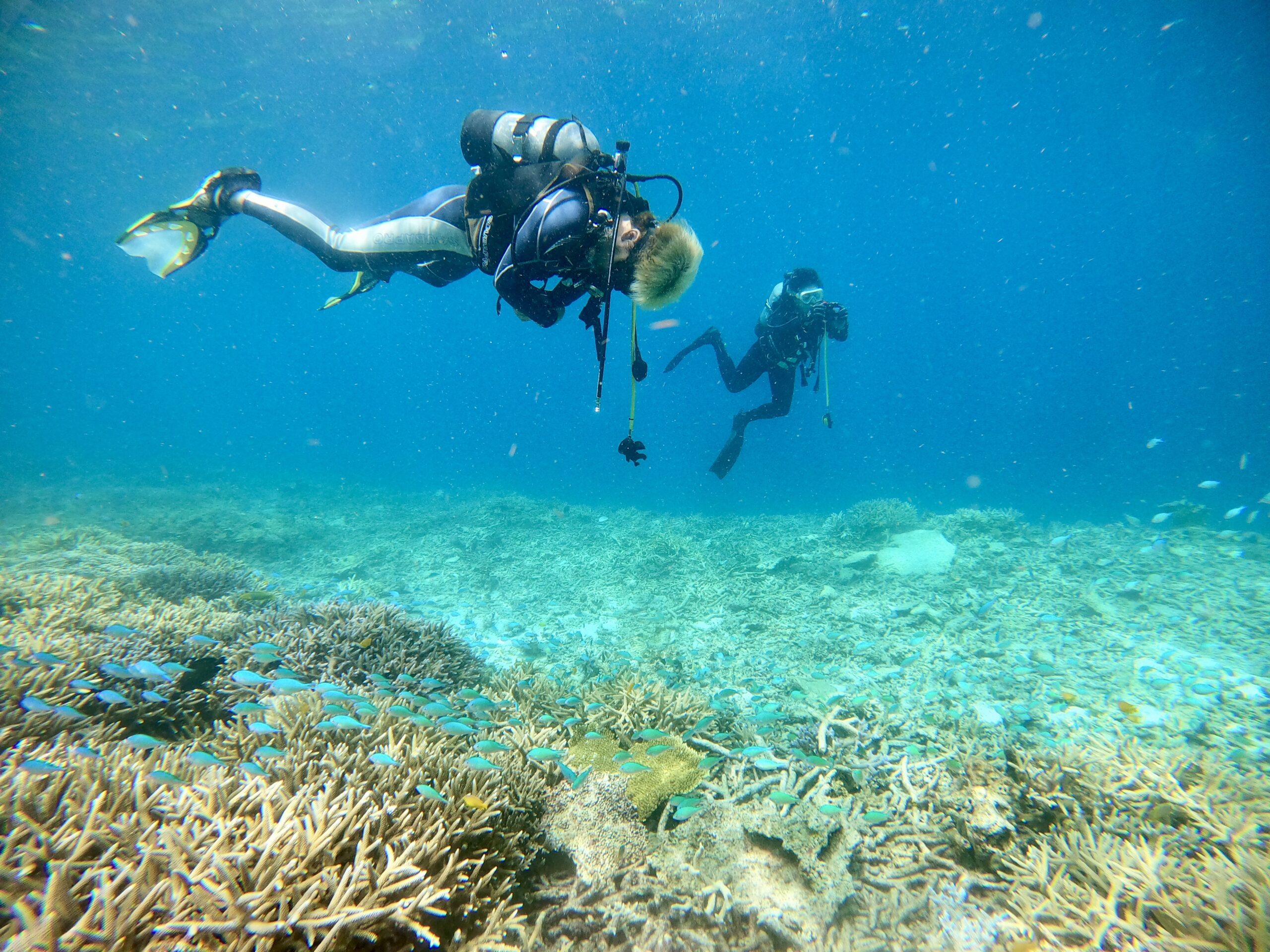 おびただしいサンゴとデバスズメダイの中を、
