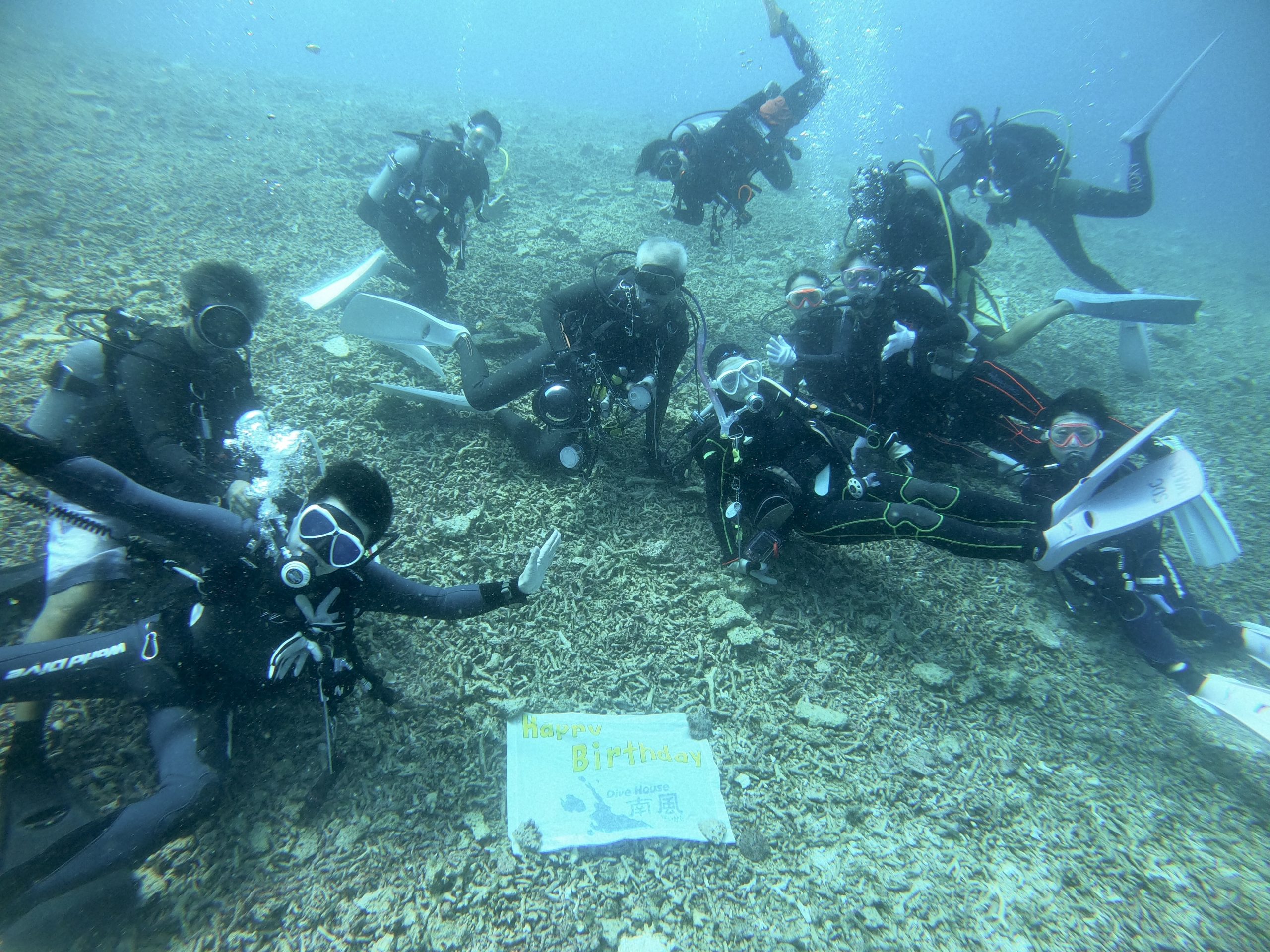 透明度もまずまずで海の中は明るいです。サンゴにはデバスズメダイの子がたくさん付いていてとっても癒されます。ナンヨウハギのちびっこも見られました。大きな根には各種スズメダイがたくさん!最後は船下で今日が誕生日のHさんを囲んで記念撮影をしてきました。