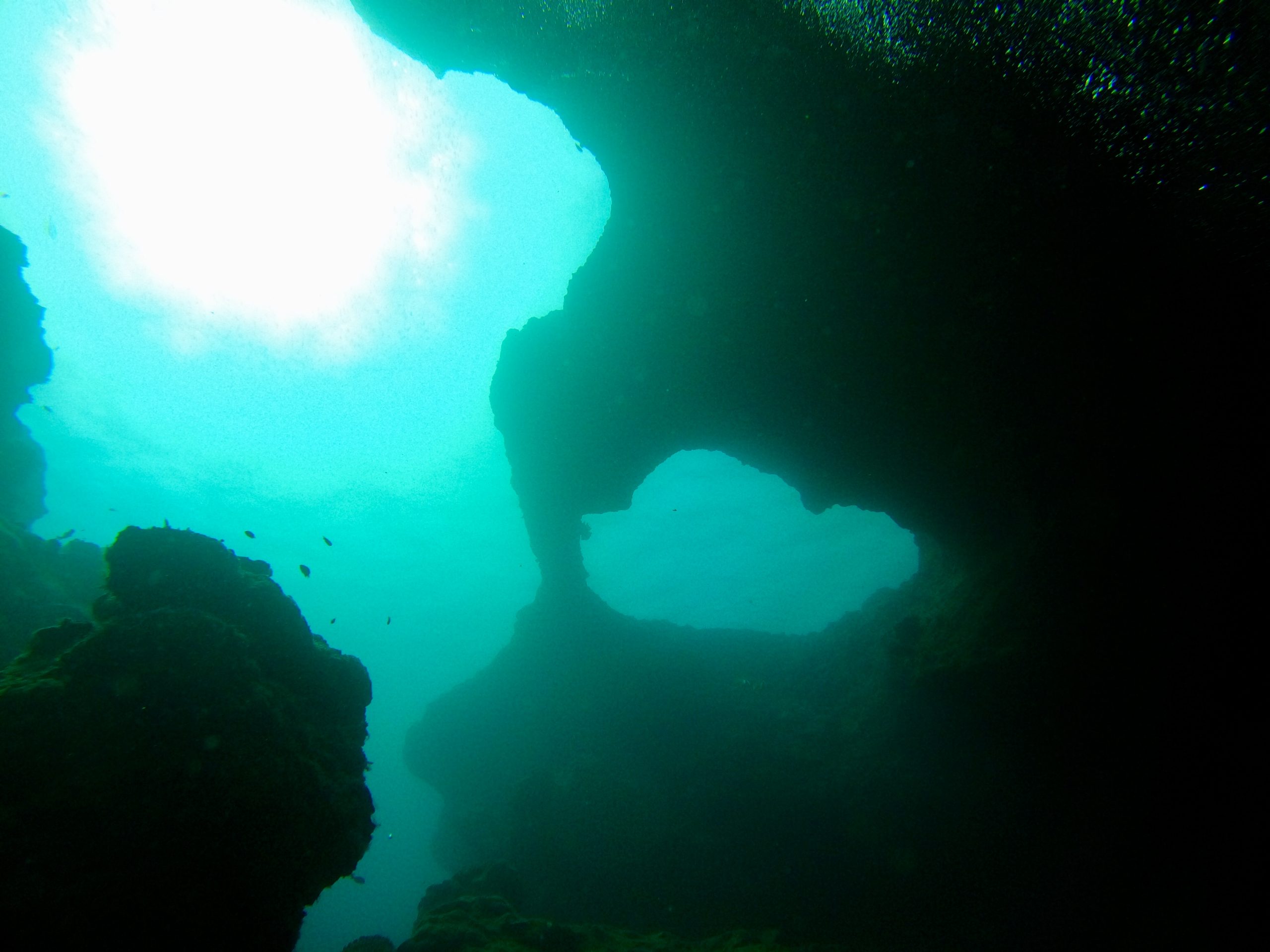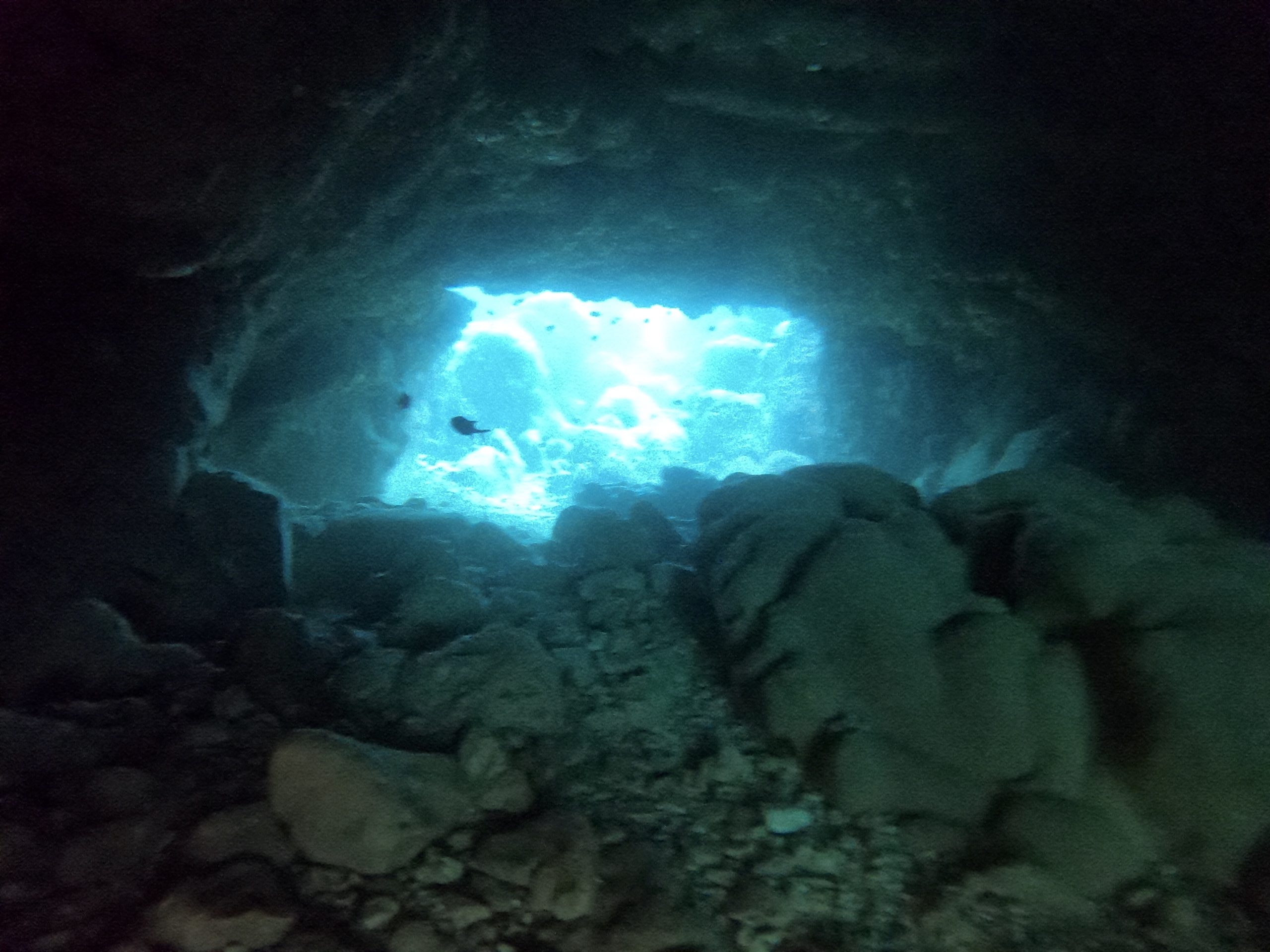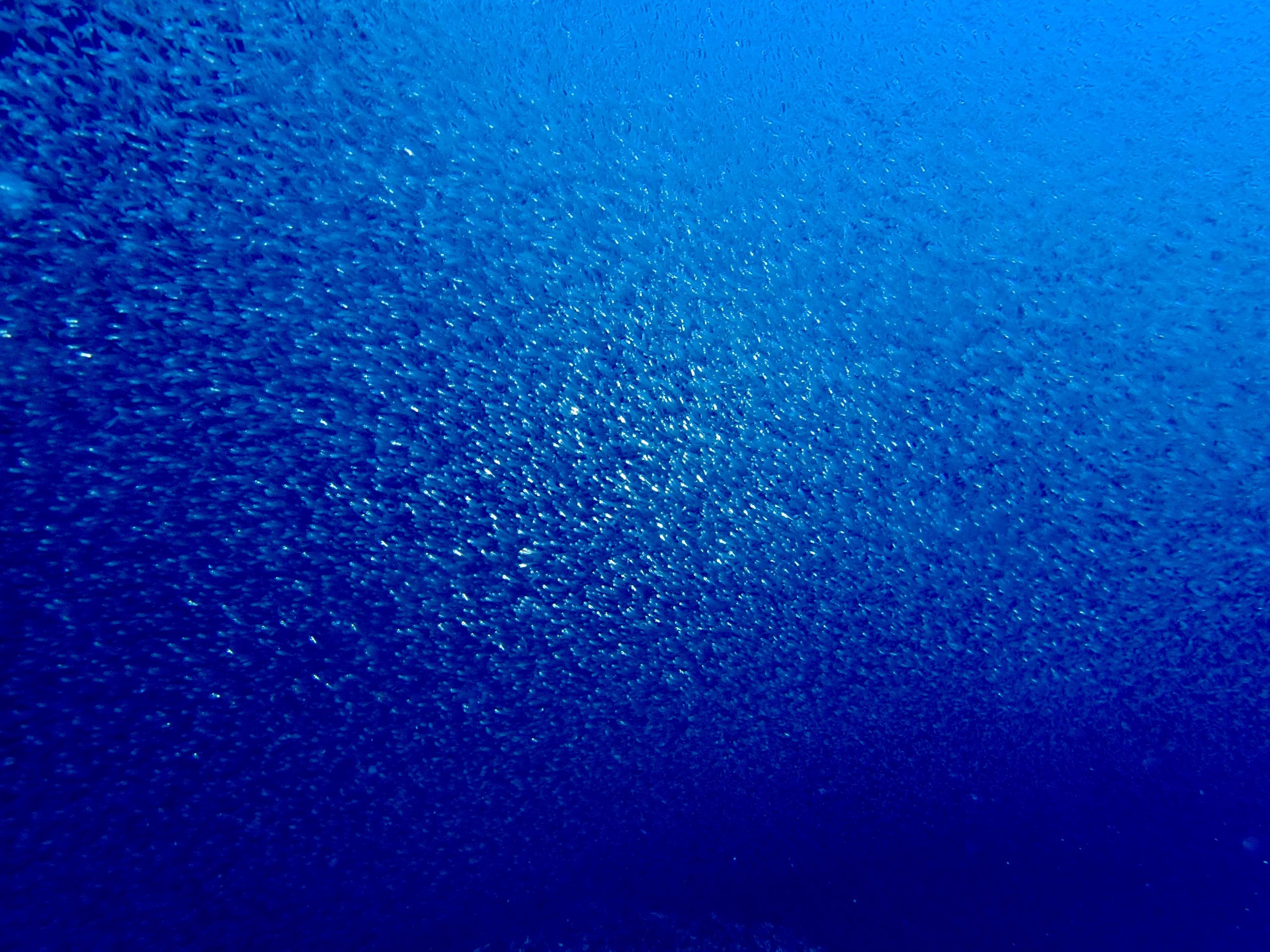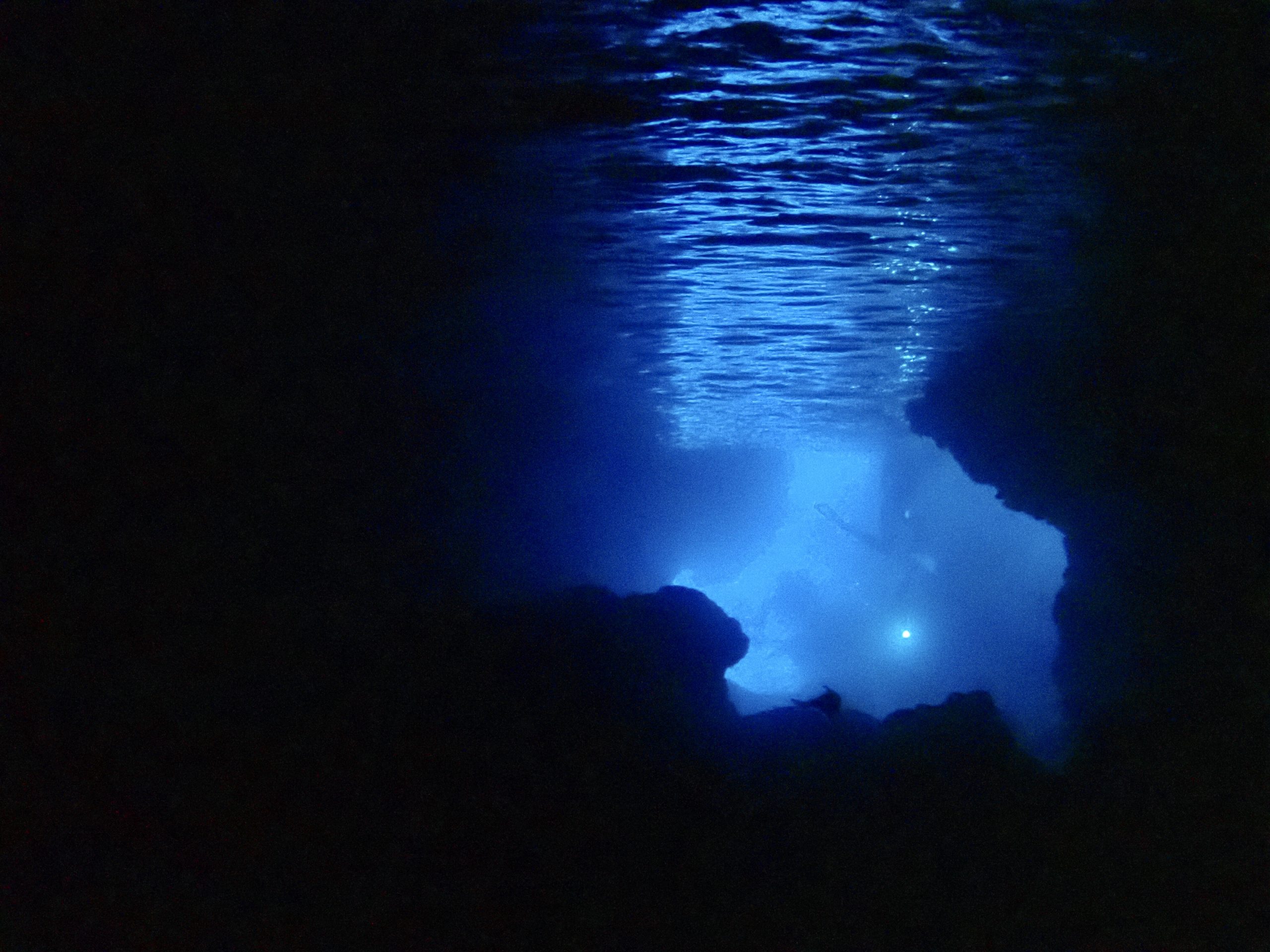 最後はツインホールへ!浅場のトンネルから入って行くと青の洞窟!青い世界が広がっています。スノーケル乗船していたKちゃんも水面から青の洞窟を楽しんできました。ダイバーチームは水面に顔を出してみたり。水面にはたくさんのカタクチイワシやキビナゴが群れていて、キラキラ群れる姿はずーっと飽きずに見ていられるほどでした。
