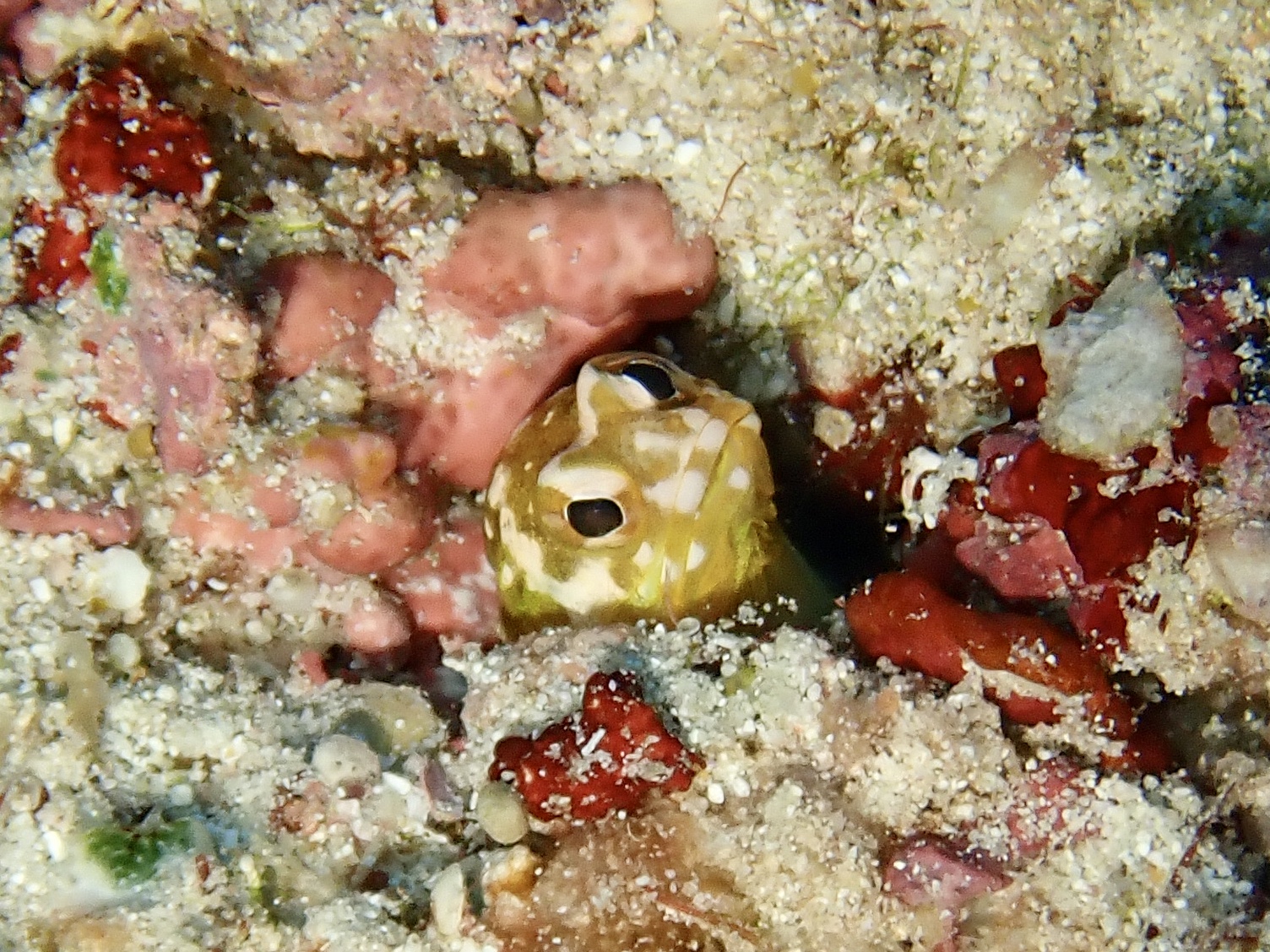 2つのポイントに分かれて潜ってきました。ヤスさんチームはL字アーチへ!アーチの中にはスカシテンジクダイがたくさん群れていました。キイロのジョーフィッシュも安定の位置で顔を出していました。