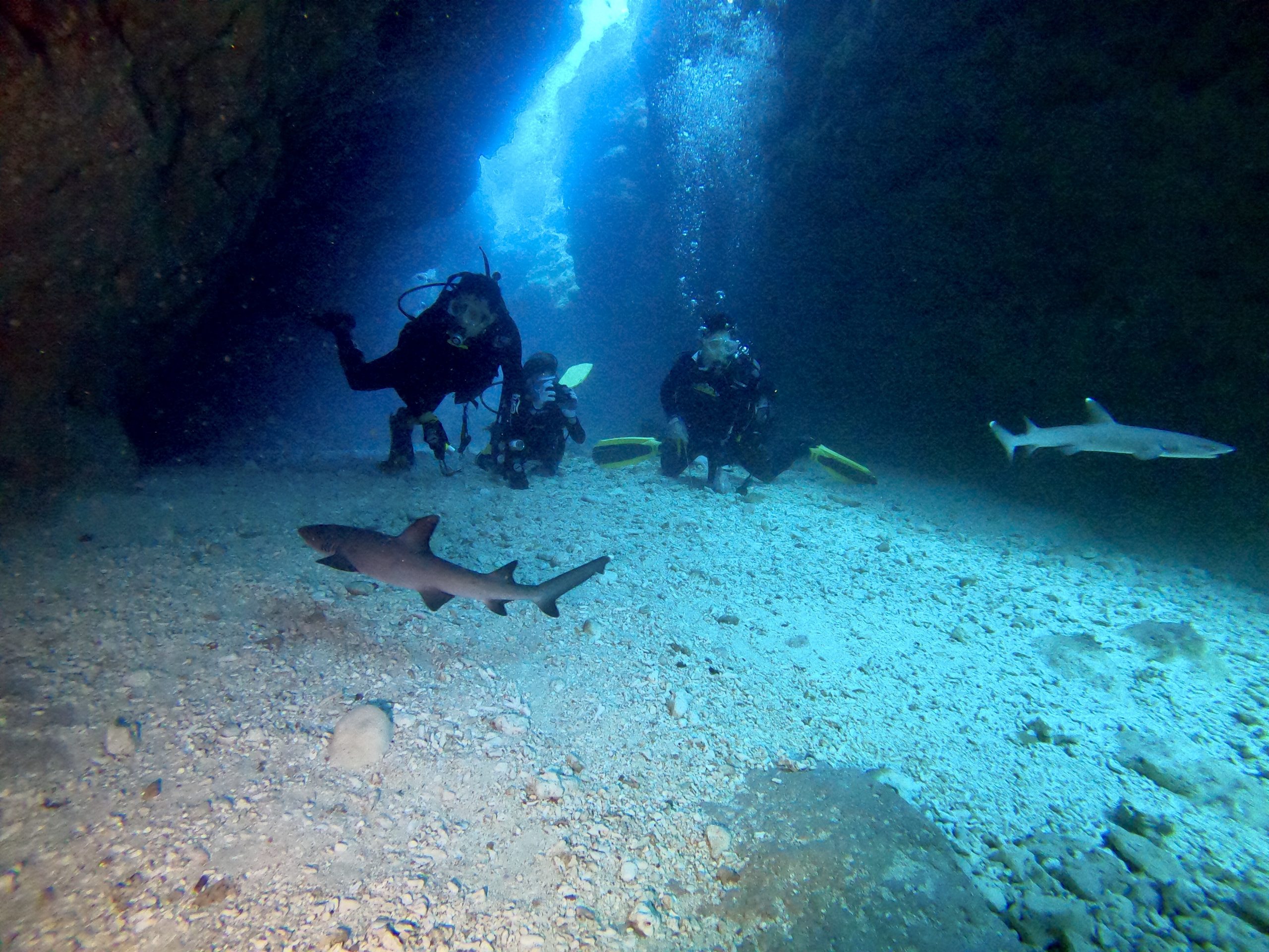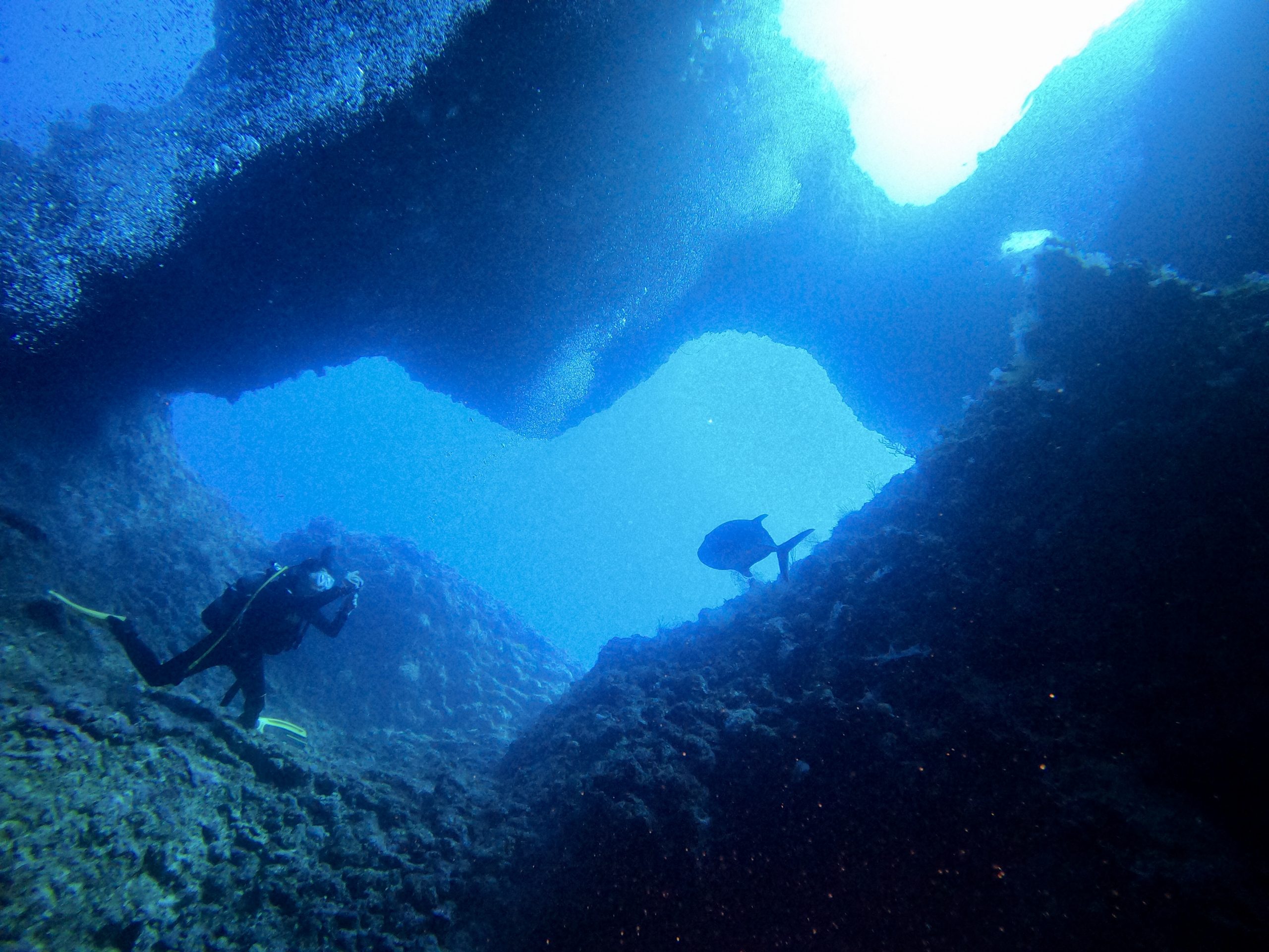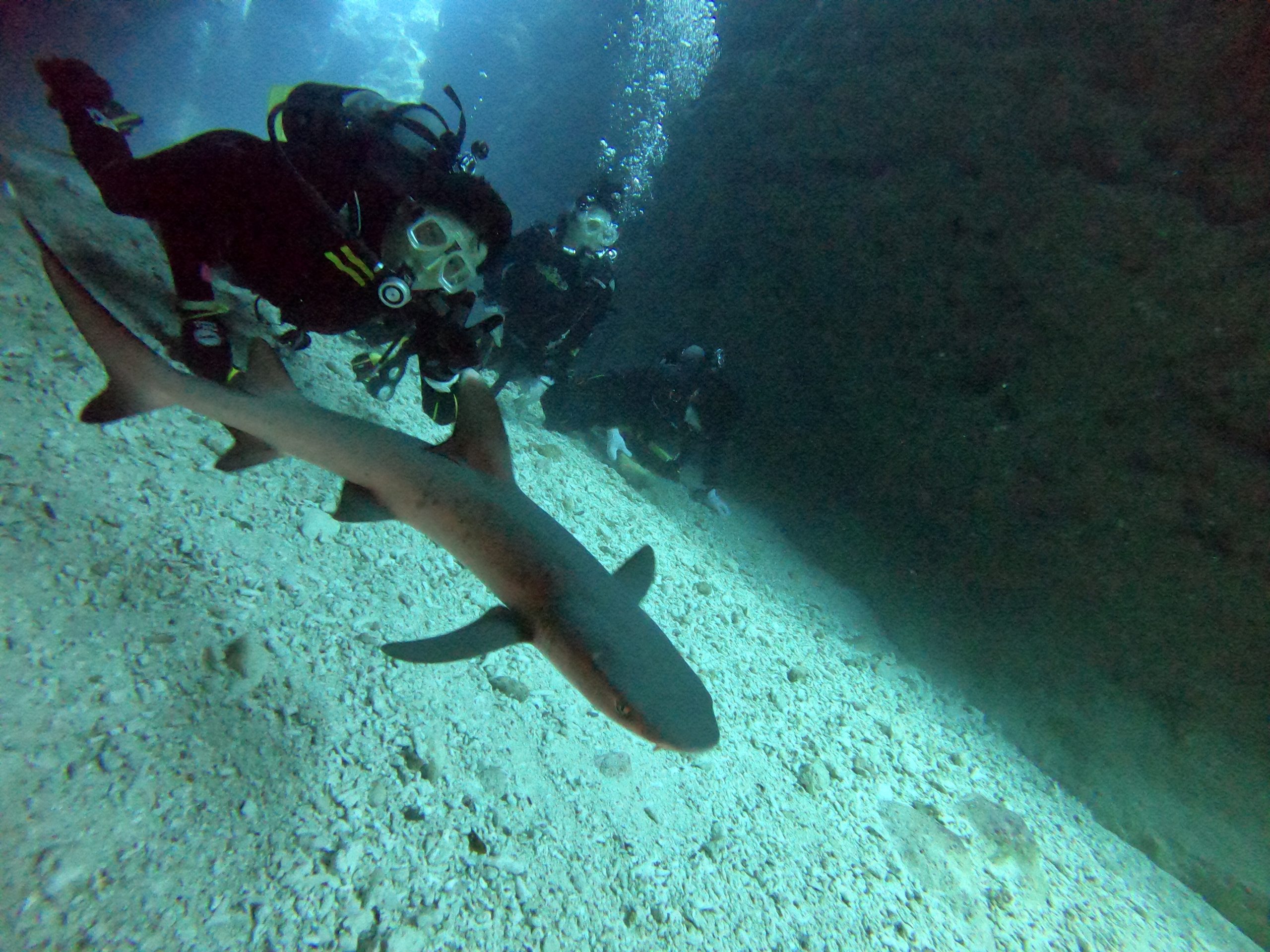 今日は中学生、高校生、大学生がダイバーとして遊びに来てくれています。朝一番はのんびり潜れるチャネルからスタート!透明度が良くて気持ち良いです。宮古らしいキレツの間を通ったり、丸いアーチをくぐったり。今日も前回と同じ位置にホワイトチップシャークが3匹並んで!途中で泳ぎだしてくれました。