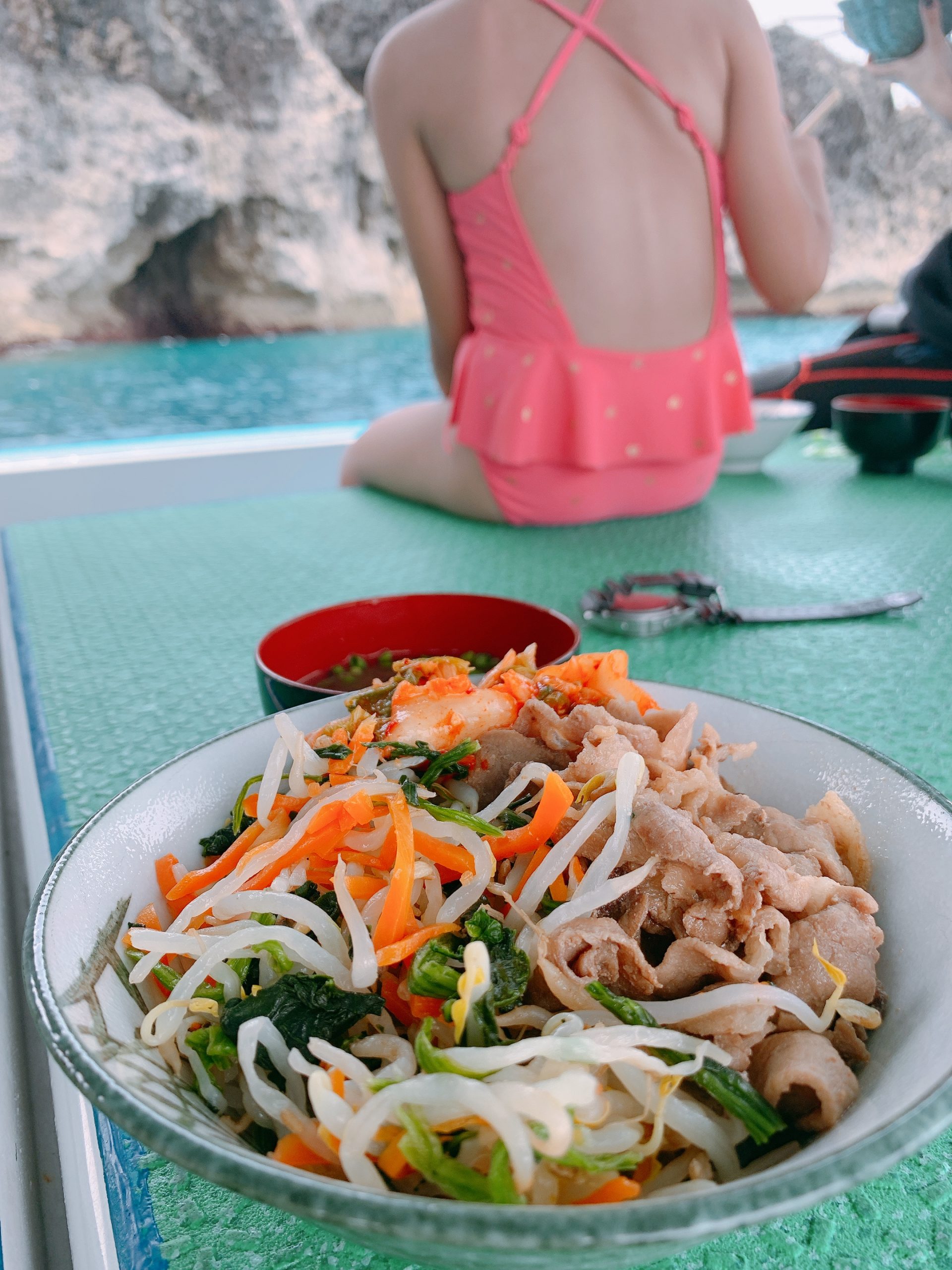 お肉を焼く良い香りが船上に広がっています~♪今日は焼き肉丼でした。みんなでお腹いっぱい食べました~♪