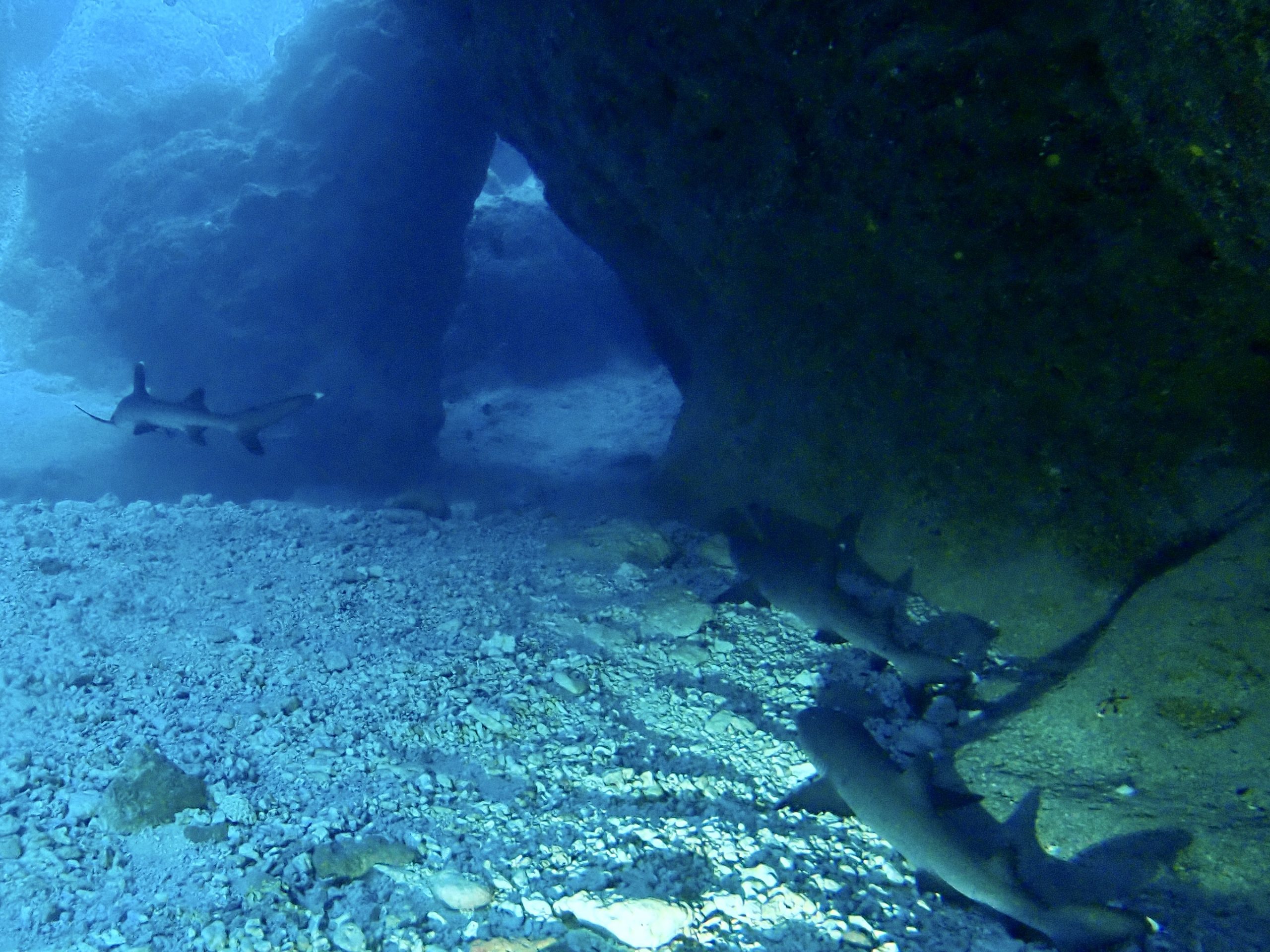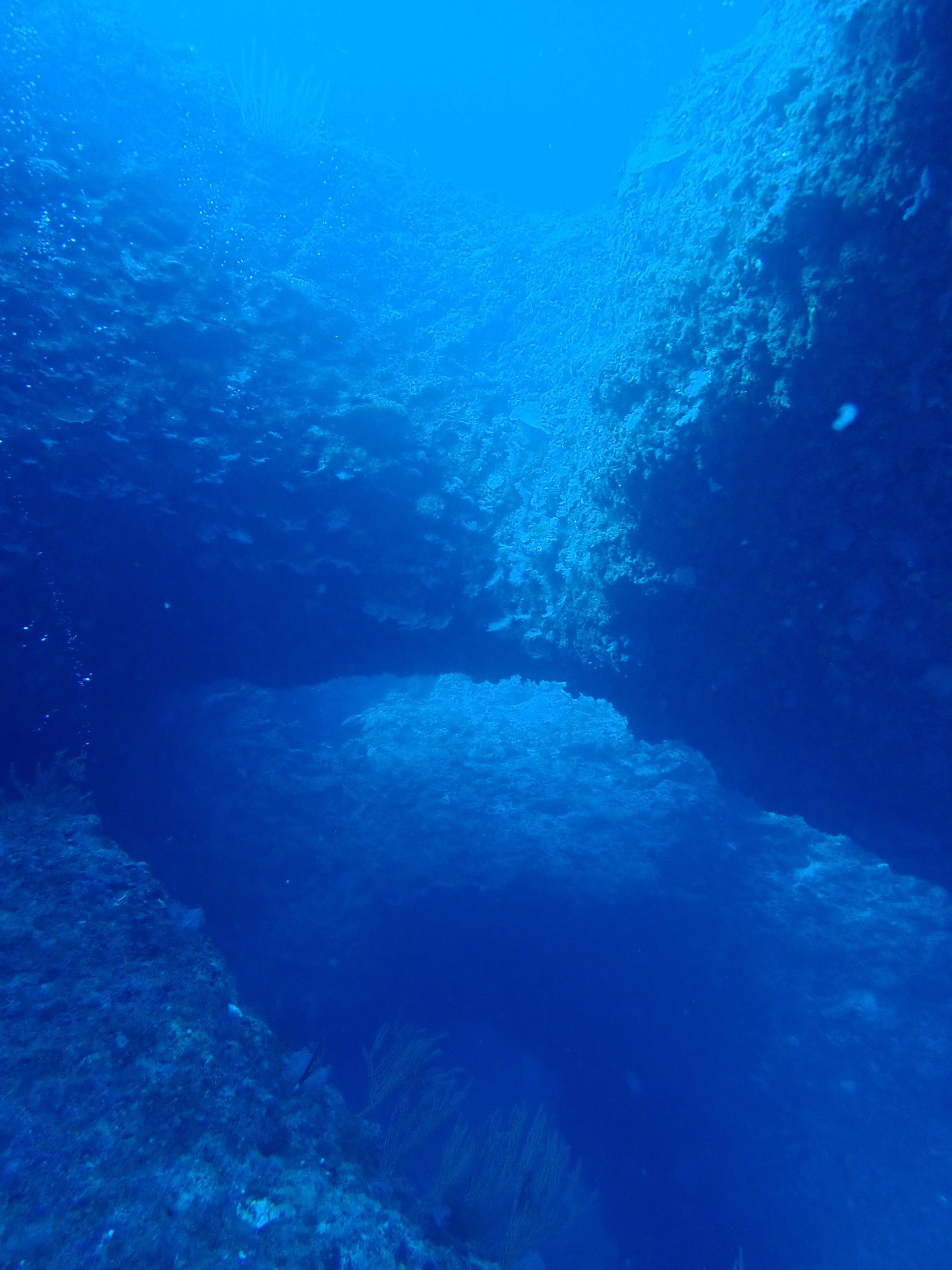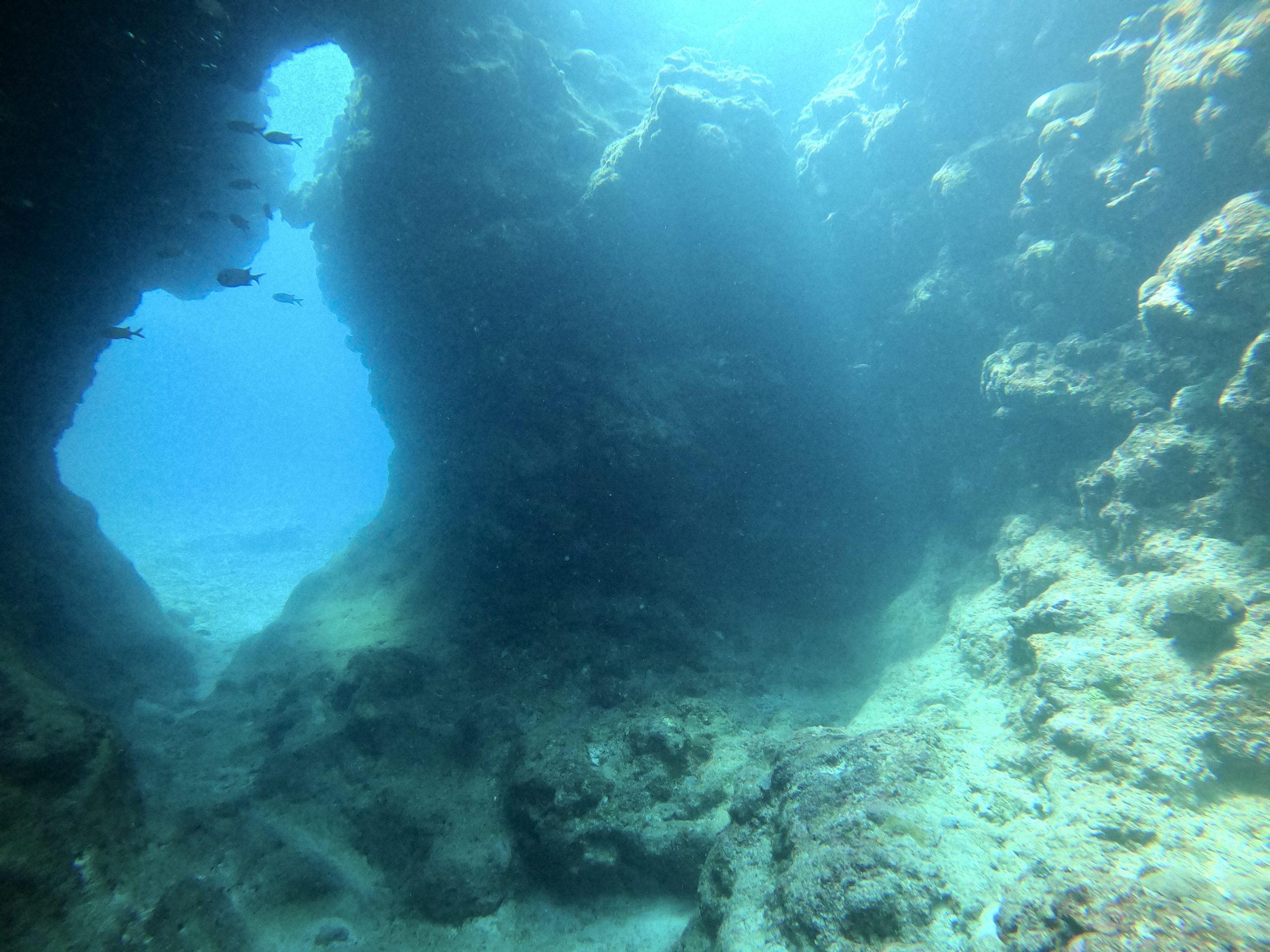 チャネルの中にも光が入ってとってもキレイでした。3匹のホワイトチップシャークも健在です。丸いアーチをくぐってみたり、くるくる変わる景観を楽しんできました。ヤスさんチームはぐるっと泳いでホソカマスにも出会ってきました。