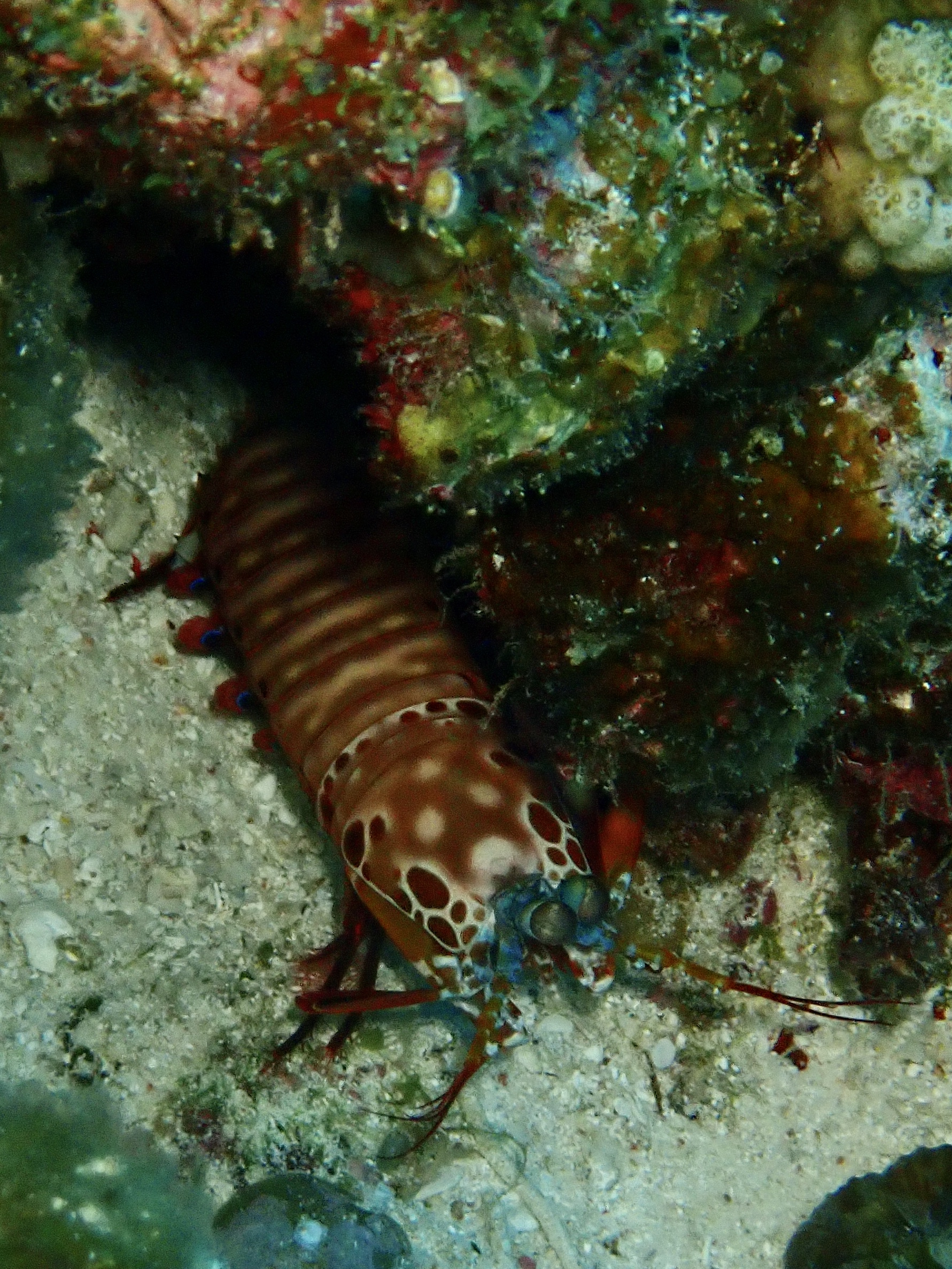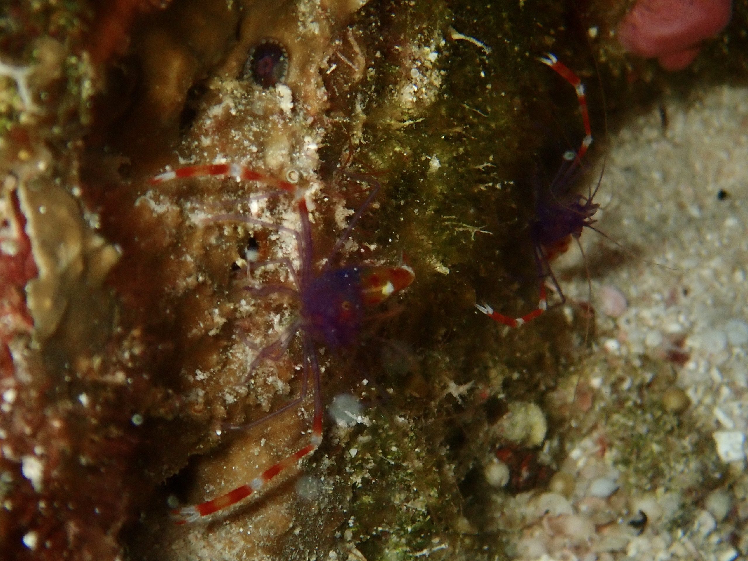 2本目はクロスホールへ!グルクンがたくさん流れるように群れていてブルーのラインがとてもキレイでした。サンゴには可愛らしいナンヨウハギも付いていました。クロスホールの中はとっても静か。太陽の光は無くても青い世界がキレイでした。ゲストが見つけたのは奥の砂地にホワイトチップシャーク。最後にはとっても珍しいバイオレットボクサーシュリンプを見ることができました。