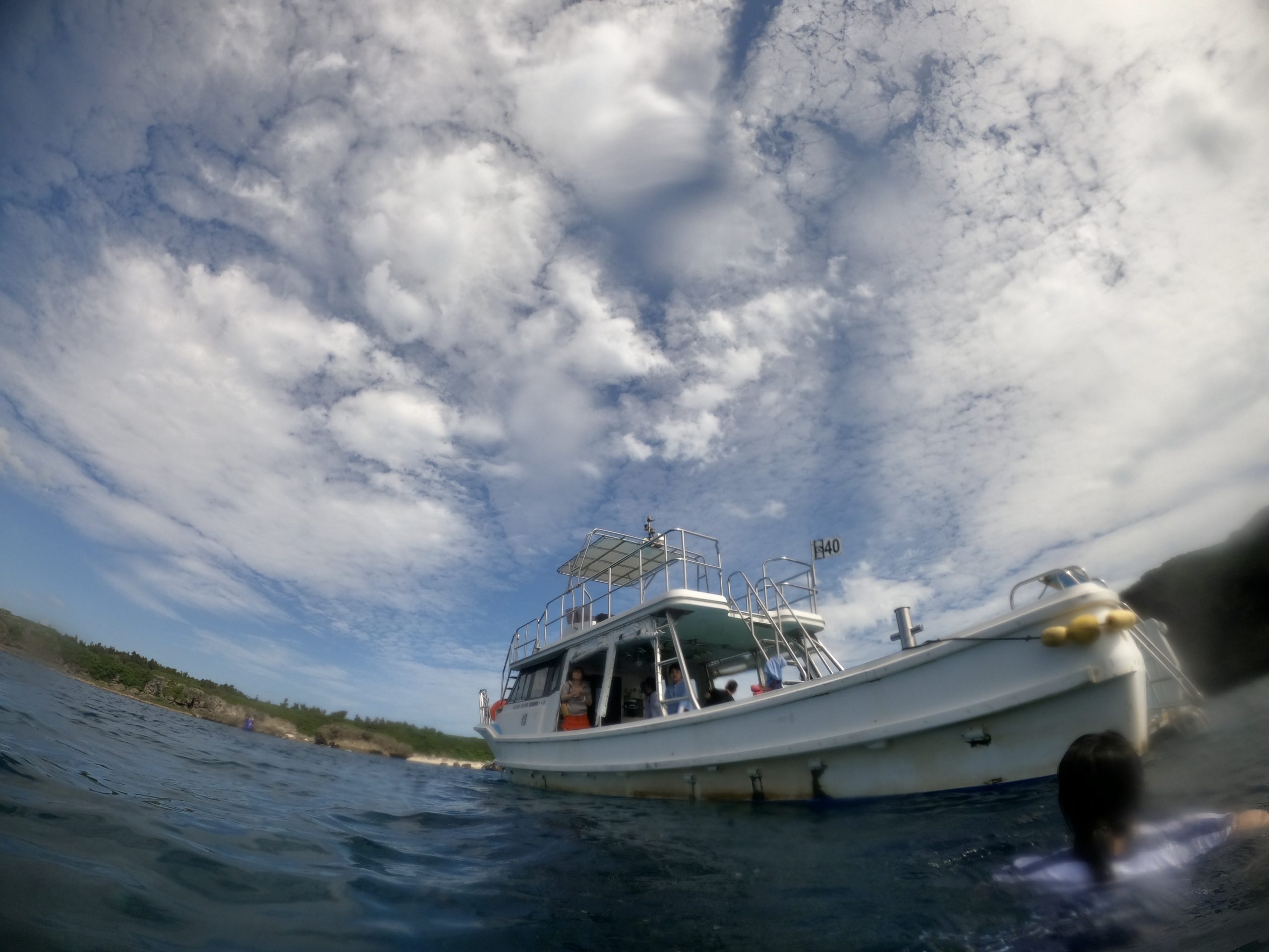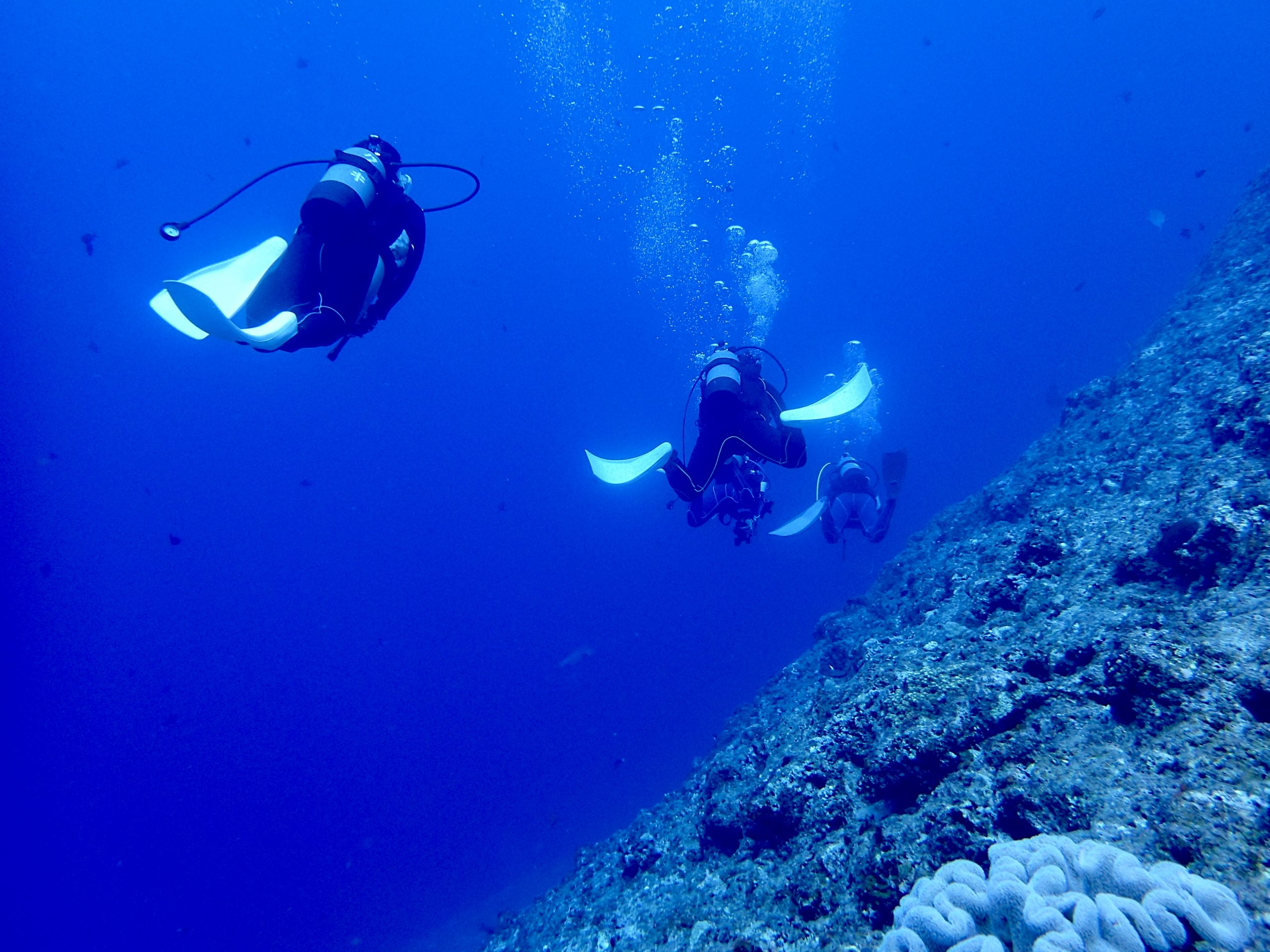まずはミニ通り池へ!すっごく青い!!マスク越しのみなさんの笑顔にこちらも嬉しくなります。ドロップ沿いの浮遊感を楽しみつつ、ミニ通り池へ向かいました。ハナゴイやアマミスズメダイがたくさん群れていました。ミニ通り池の水面に浮上すると、ご機嫌のゲストさん。ダイビング途中に浮上するなんで、宮古ならではですね!!