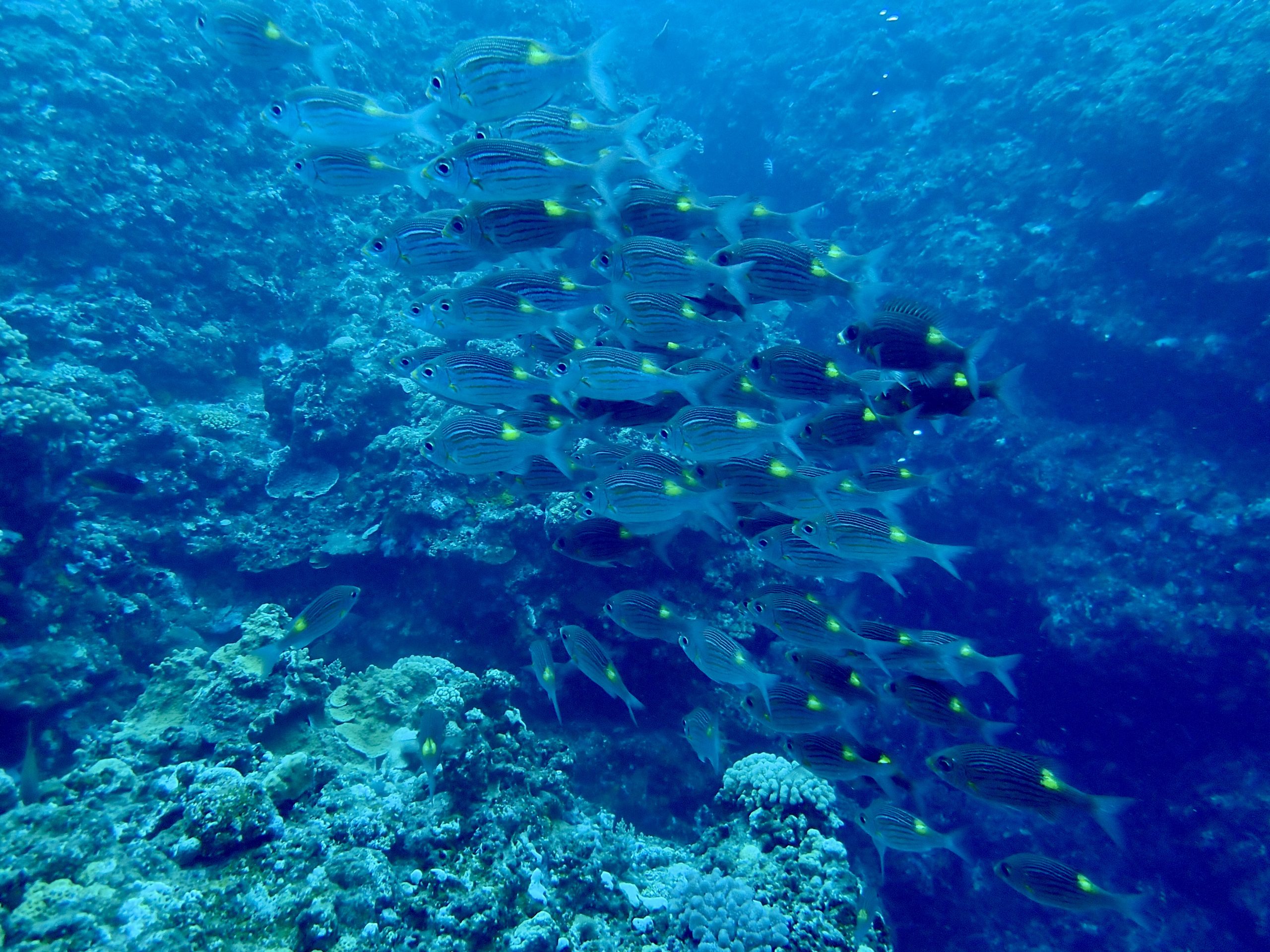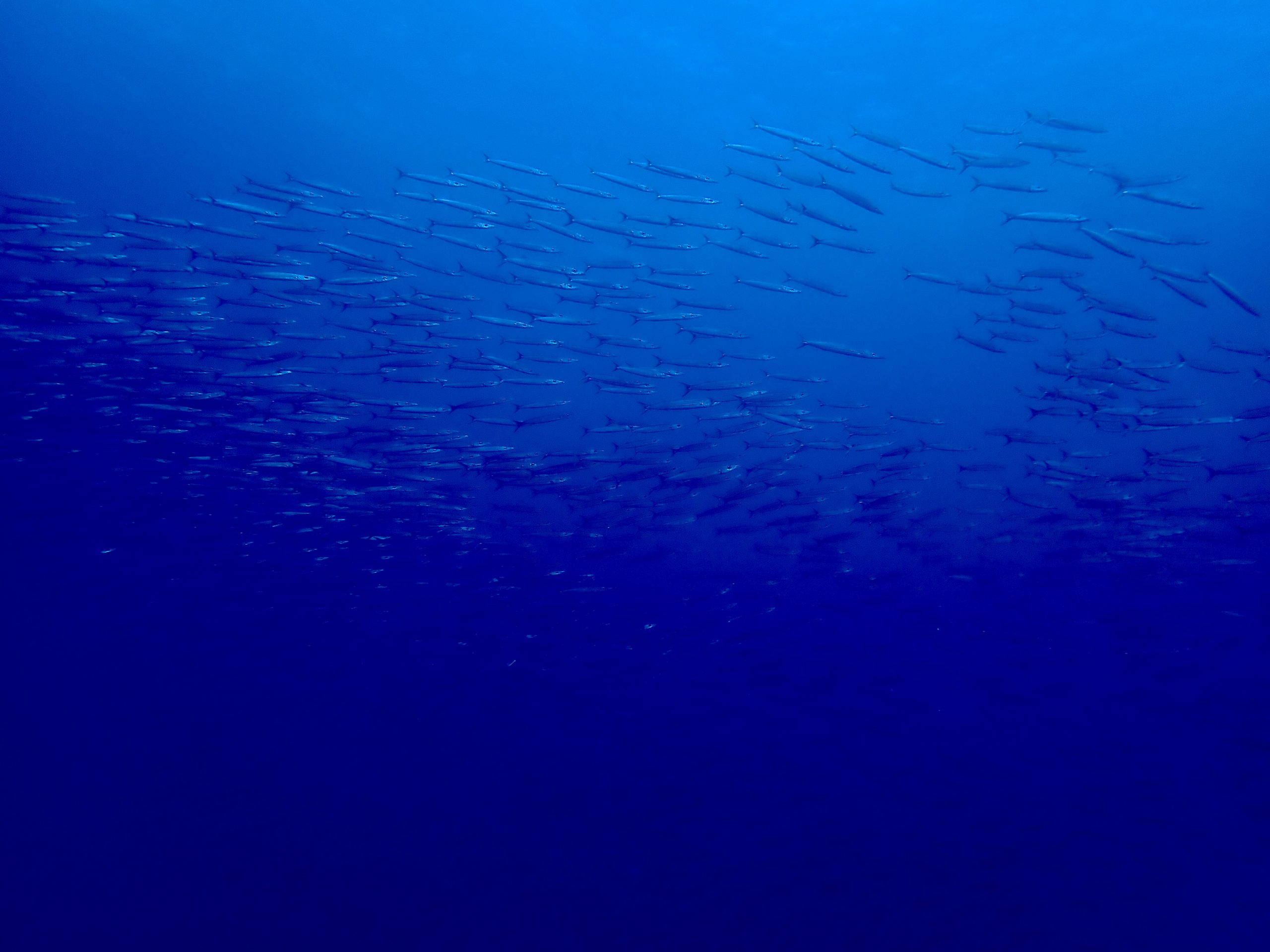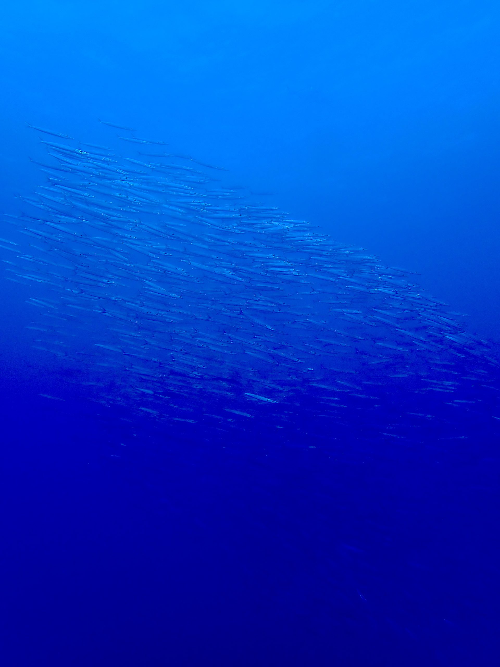 最後はオーバーハングへ!根の下まで降りてのんびりしていたら、根の上にホソカマスの群れが登場!そして、その上には大きなロウニンアジ!みんなで圧巻の群れを眺めていたら、サバヒーが突如ホソカマスに突っ込みました。もうみんなで大興奮!ホソカマスの群れに近づいてみたりと時間いっぱい遊ばせてもらいました。