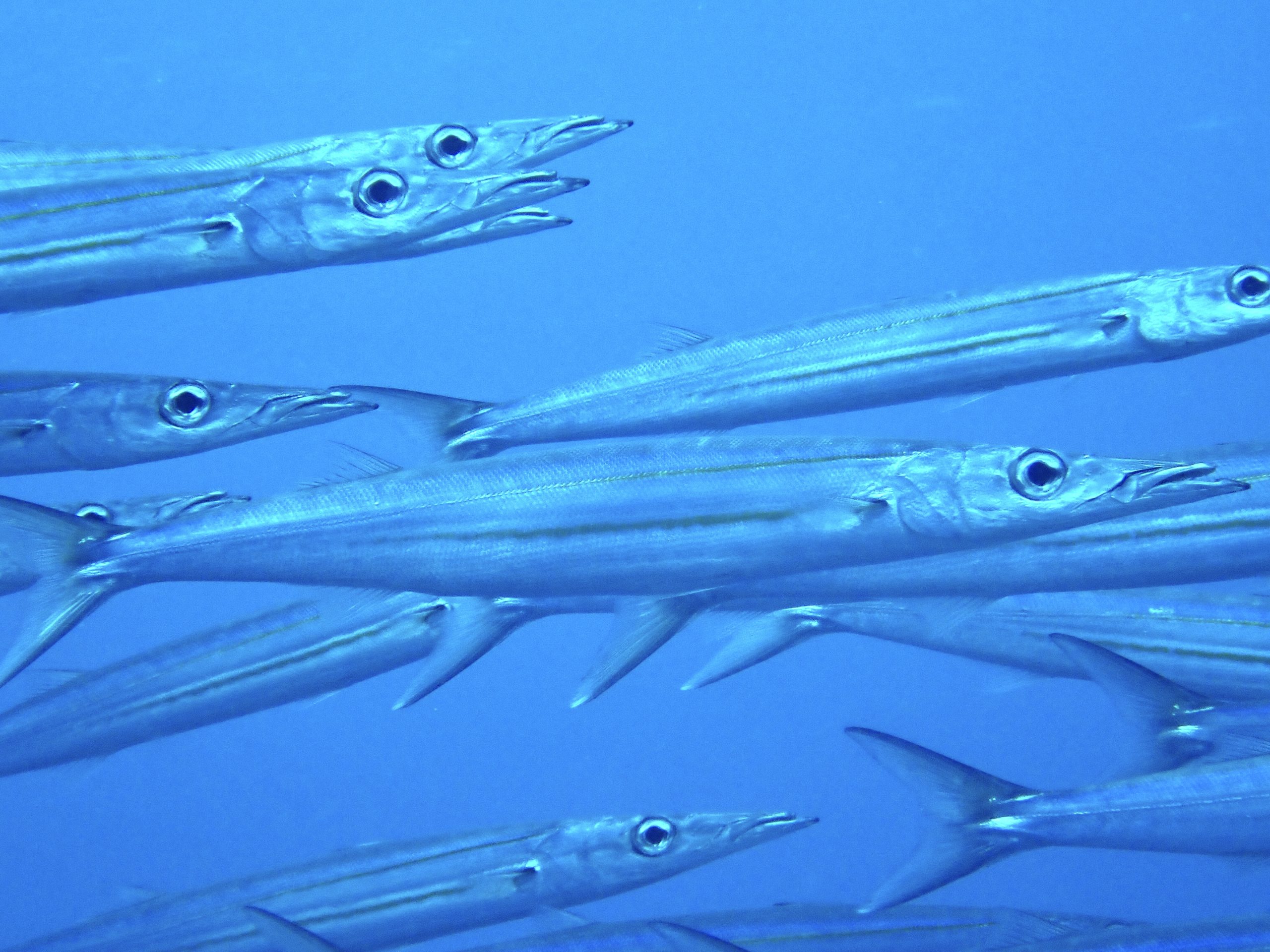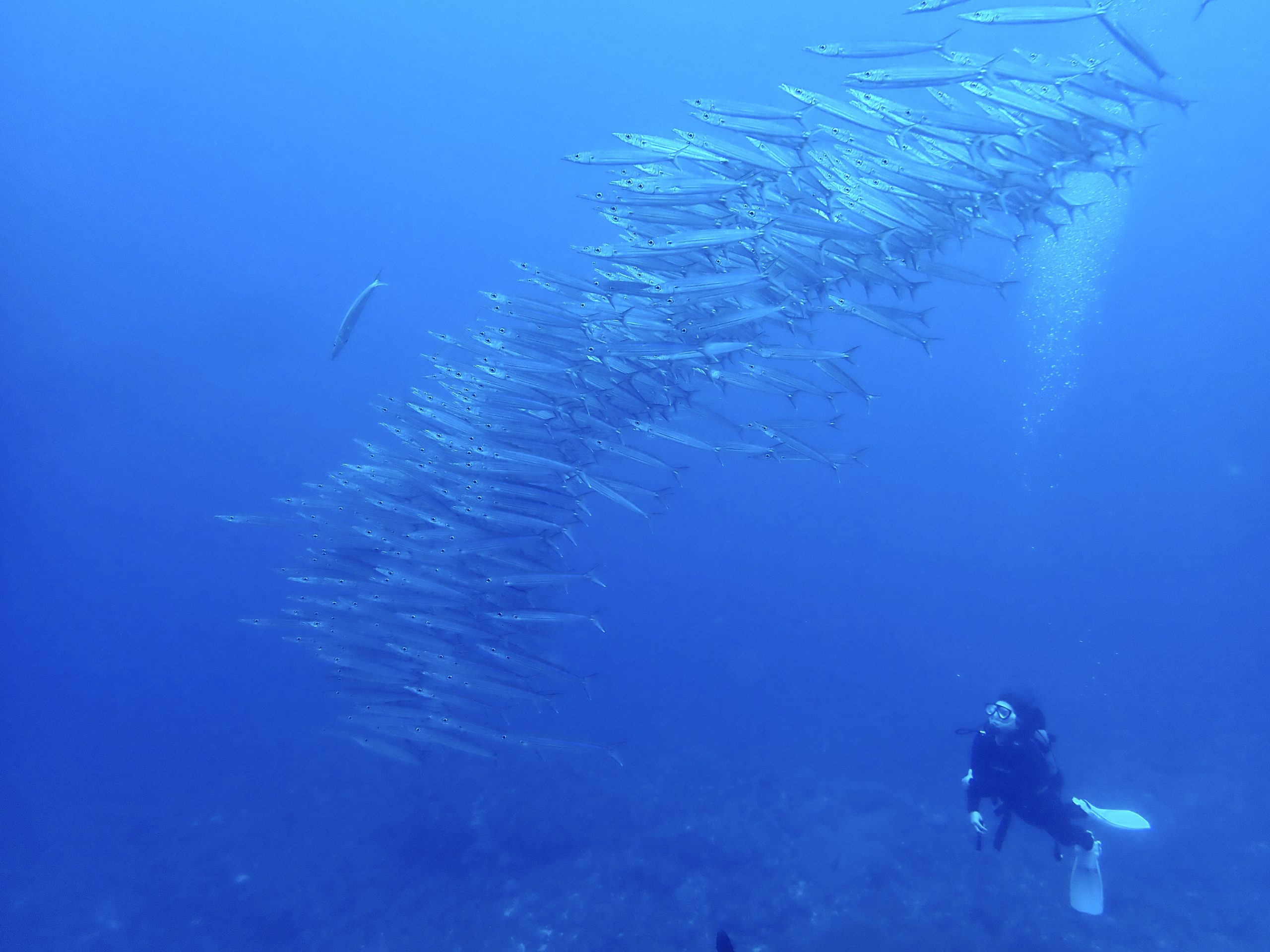 #今日紹介した生物 カマスの群れ ナポレオンフィッシュ キイロウミウシ ノコギリガニ イソコンペイトウガニ コクテンフグ