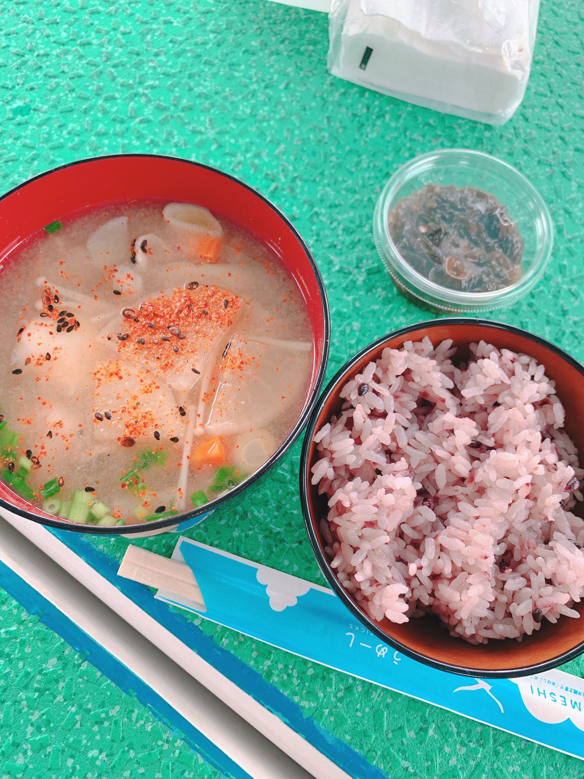 黒米ごはん、とん汁、もずくキムチ