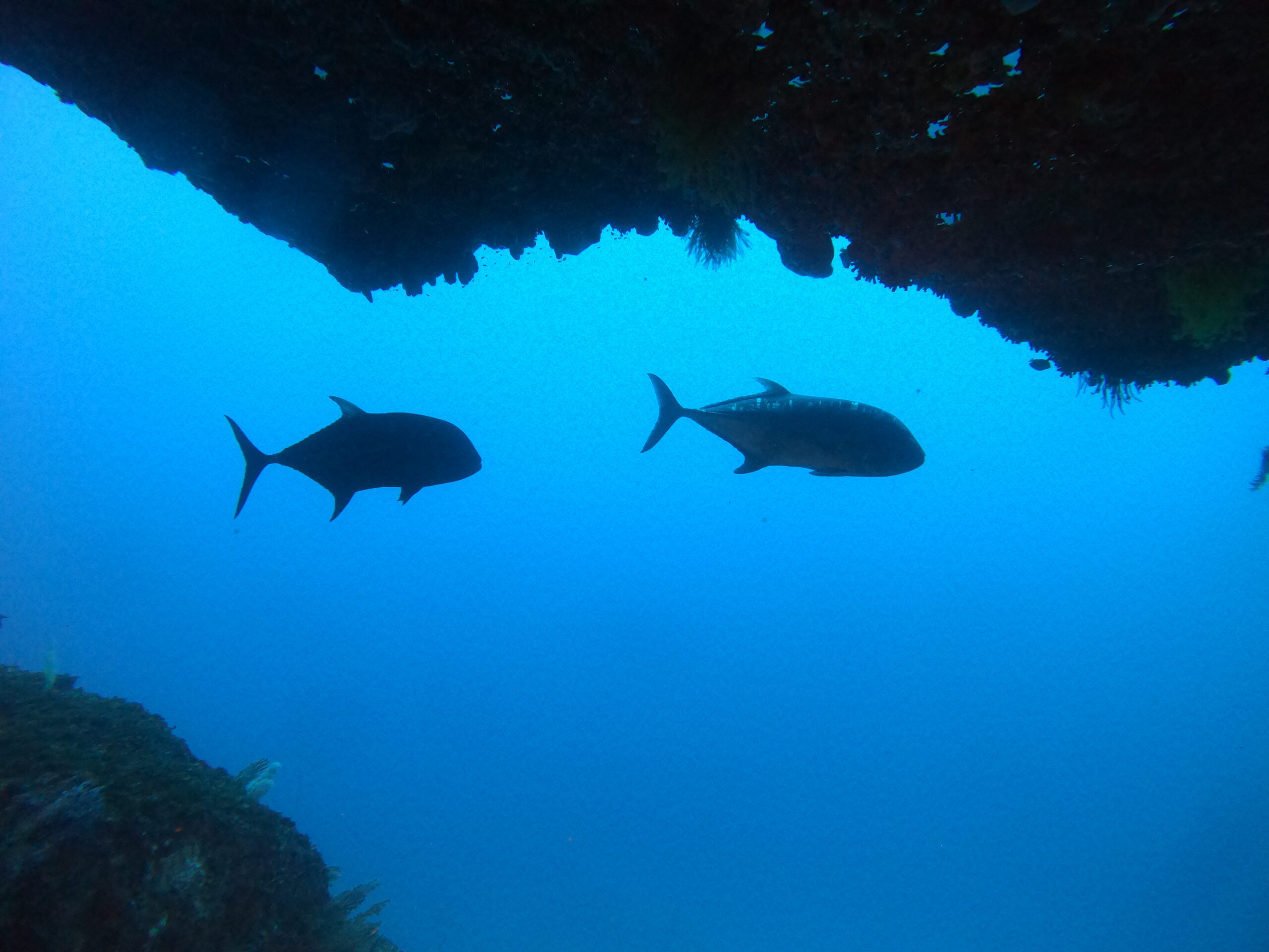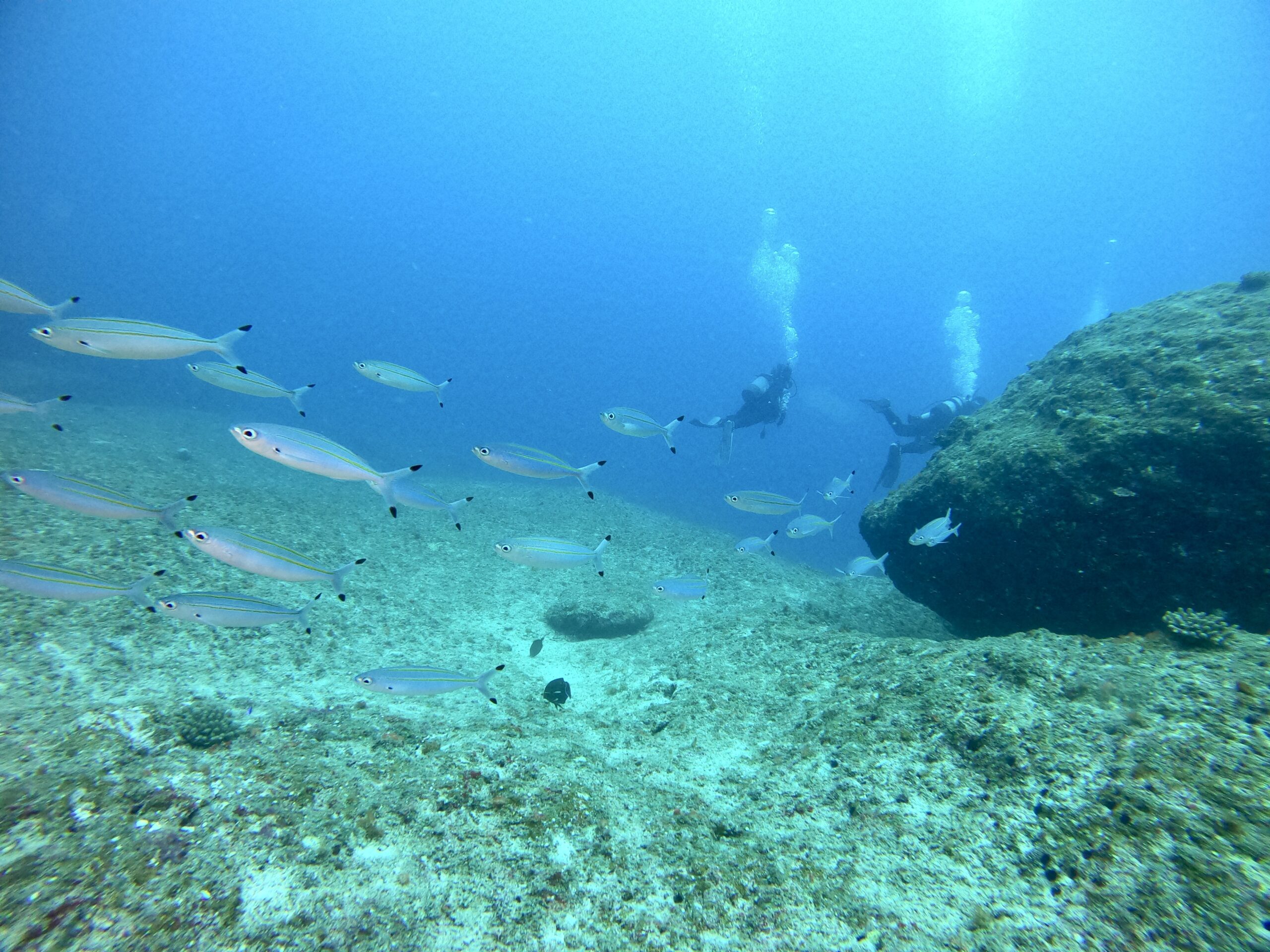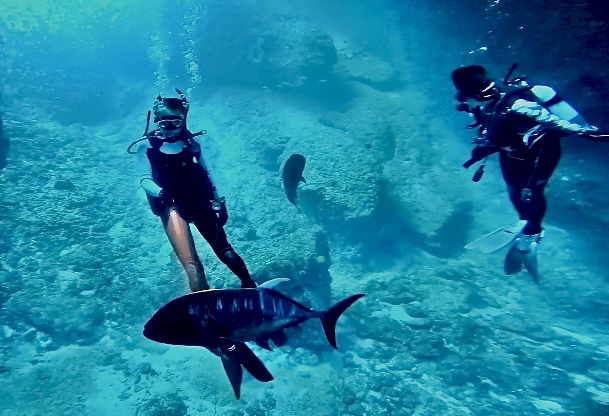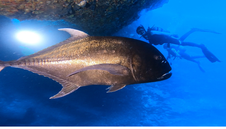 3匹のロウニンアジがゲストのまわりをぐるぐる。