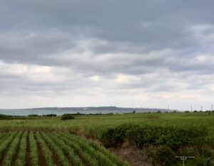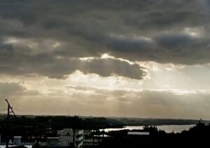 雲の切れ目から太陽の光が放射線状に降り注ぐ風景です。